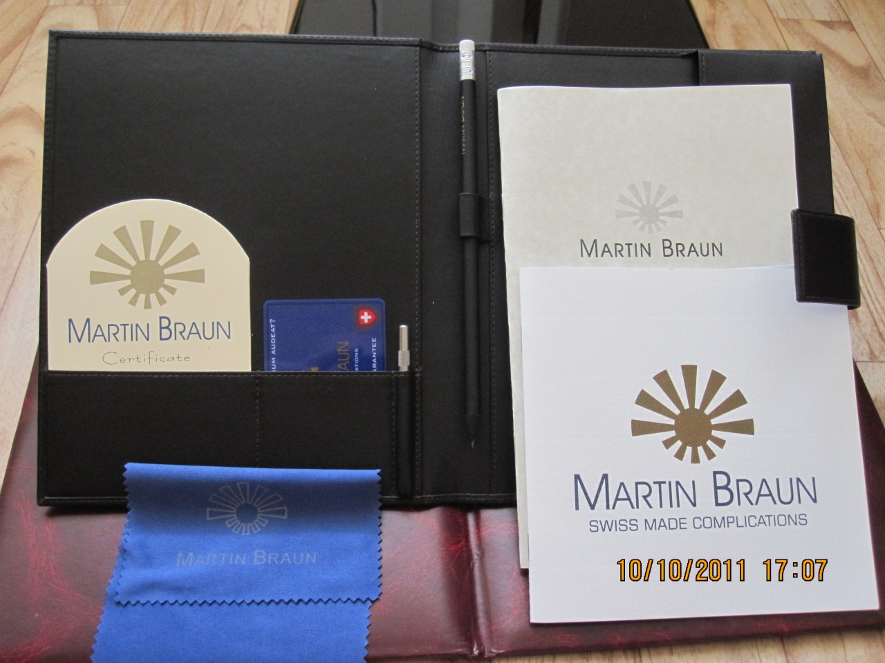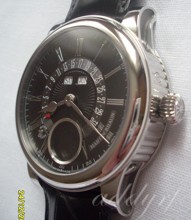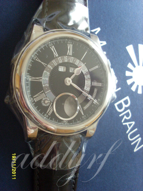 Можно сказать, что новые (одел, несколько раз) , с полным комплектом документов и коробок. Автоматический мануфактурный механизм, Калибр МАБ 88. Диаметр -44.5мм. Запас хода 42 часов. Частота 28,800 полуколебаний в час, 25 драгоценных камней. Сапфировое стекло. Прозрачная задняя крышка. Водонепроницаемость 50 м. Вышитый вручную ремешок из кожи крокодила, с выгравированным логотипом Мартина Брауна, дополнительно- миланский металлический браслет. Функции: часы, минуты, дата, фаза луны. Точность отображения "большой" лунной фазы такова, что отклонение всего в одни лунные сутки всплывет только после непрерывного ношения часов в течении 122 с половиной лет! Это единственные часы в мире, где лунный диск движется не пошагово, а плавно и может быть откорректирован с точность до минут!