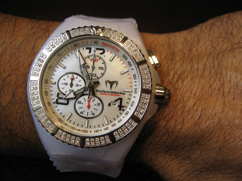 водозащита 200 м, часы крупные 45мм и массивные, циферблат перламутр и в морской воде с бриллиантами бликует непередаваемо, когда нырял с маской даже черепаха подплывала посмотреть время