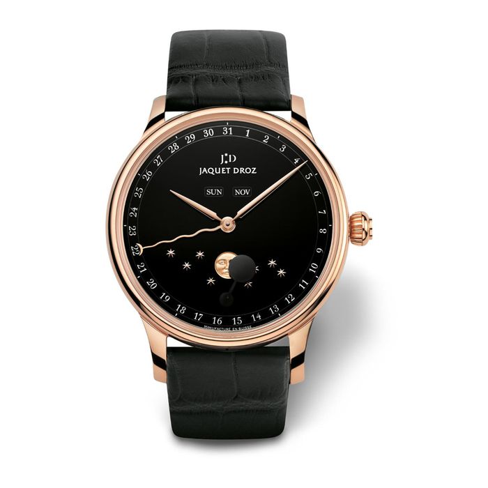 Jaquet Droz The Eclipse Onyx получились завораживающе красивыми. Циферблат часов сделан из темного оникса и символизирует собой ночное небо, на котором сияет золотом лик Луны, окруженный крошечными звездами. Помимо указателя лунных фаз, у часов необычный индикатор даты – это волнистая длинная стрелка с серповидным наконечником. День недели и месяц отображаются в двух апертурах на «12 часах». Внутри находится автоматический механизм с двумя заводными барабанами, обеспечивающими изысканному луннику 68-часовой запас хода.