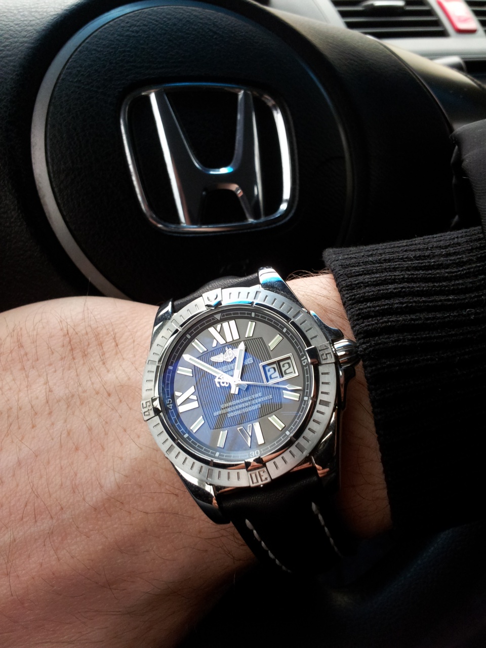 Здравствуйте уважаемые любители прекрасного! Принимайте в коллектив любителей Breitling! Обзавелся Кокпитом! Давно запала в душу эта модель, именно в этом дизайне. Вот собственно мечта и осуществилась. Часы нравятся абсолютно всем. Размер на ежедневную носку очень комфортен. Очень радует большая дата. Очень удобно, и смотрится здорово. Так же очень понравилось то, как меняется число: не ползет постепенно в течении получаса, а перещелкивается, без пяти минут двенадцать, моментальным щелчком. Мелочь, а приятно. И хотя я не фанат постоянно засекать точность часов в сутки, для проформы все же это сделал, и был очень приятно удивлен, т.к ход в сутки вышел в ноль. А за неделю ушли в +2 секунды! В общем новому приобретению очень рад! И по традиции несколько фото. Телефонные.