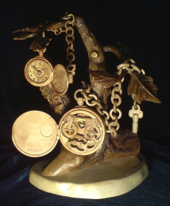 Свои первые карманные часы Валерий Даневич изготовил в 2008 году. Корпус диаметром 55 мм он выточил из березы. Механизм состоит из 13 колес, анкерного колеса, анкерной вилки, приводного барабана с металлической пружиной, колеса баланса с металлической спиралью; все это смонтировано на одной круглой платине и 5 мостах. Все колеса – березовые, мосты сделаны из черешни и клена, оси – из груши и бамбука. Циферблат кленовый, а стрелки и часовые индексы – из красного дерева. К корпусу крепится кленовая цепочка с ключиком, который служит для подзавода часов и перевода стрелок. Время завода составляет 15 часов.