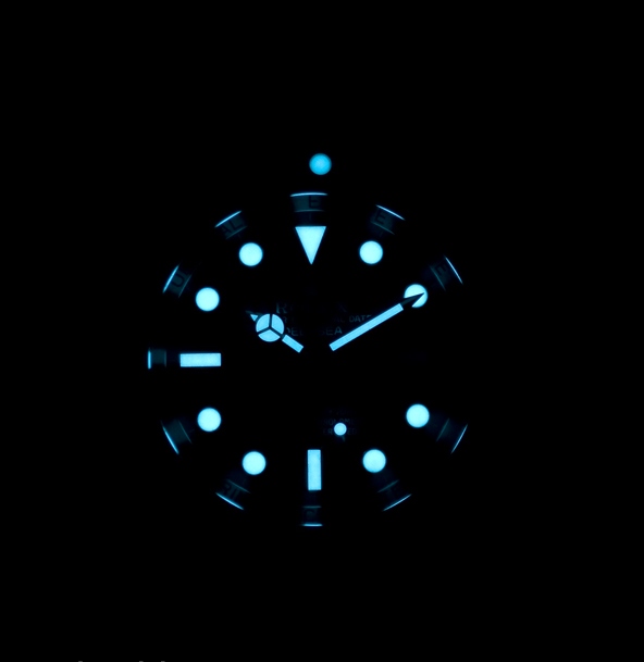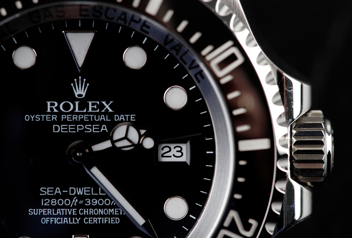 Яркое голубое свечение делает хорошо заметными в темноте три главных элемента индикации часов Rolex Deepsea: нулевую отметку градуированного безеля, метки на циферблате, а также часовую, минутную и секундную стрелки.