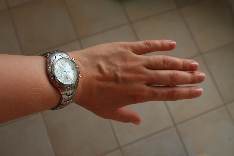Перламутровый цифер, просто балдею от него Синёная центральная секундная стрелка. Алмазные часовые метки в восьмигранных полированнных стальных ложах. Достаточно нарядно, чтобы часы были отчётливо женские; но не черезчур гламурно, сохранятеся спортивный облик.
