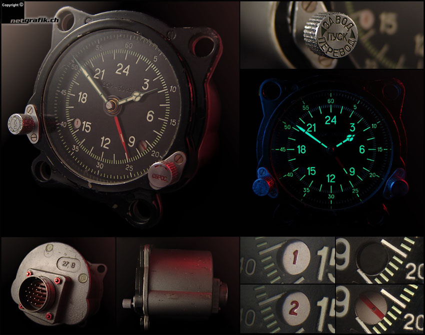 Часовой "блок 55М" предназначен для измерения текущего времени в часах и минутах и коммутации электрических цепей в соответствии с заданной временной программой в авиационной технике. Часы устанавливались на один из блоков системы опознавания "6201" (свой-чужой) и предназначались для автоматического переключения кодов опознавания самолётного радиолокационного запросчика-ответчика. Имеют встроенный блок переключателей и, в отличие от обычных часов, 24х-часовой циферблат, для исключения двойного срабатывания в сутки. Шкалы и стрелки покрыты светомассой ВРЕМЕННОГО(!) действия (к радиоактивности не имеет никакого отношения), которая обладает эффектом остаточного свечения в темноте после облучения обычным светом, или яркое свечение в темноте под действием ультрафиолетового облучения арматуры АРУФОШ, применяемой для подсветки приборов самолётных кабин. Красная стрелка предназначена для установки времени срабатывания контактной группы. Так-же происходит автоматическое срабатывание в 24.00. Система "6201" стояла на всех самолетах и вертолетах МО СССР(РФ). Скорее всего и сейчас стоит. Прибор выпускается Челябинским часовым заводом.