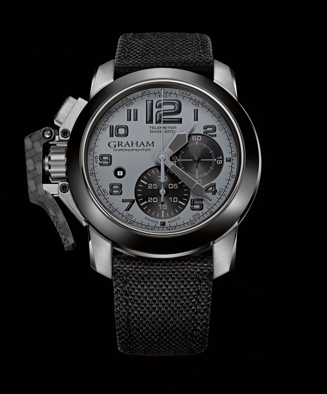 Новая модель Chronofighter Oversize от британского часового бренда, выпускающего свои часы в Швейцарии, GRAHAM имеет круглый корпус, изготовленный из нержавеющей стали с черным PVD-покрытием, диаметром 47 мм, водонепроницаемый до 100 метров. Фиксированный черный керамический безель. Рычаг запуска и остановки хронографа, расположенный на левой стороне корпуса, выполнен из черного углеродного волокна. На передней стороне корпуса установлено выпуклое сапфировое стекло с двусторонним антибликовым покрытием. На его задней крышке - тонированное сапфировое стекло. Циферблат черный или серый, с арабскими цифрами и стрелками, покрытыми люминесцентным составом SuperLumiNova черного, бежевого цвета или цвета хаки. На периферии циферблата расположена круглая телеметрическая шкала, проградуированная для измерений при температуре воздуха 25° C, о чем и свидетельствует надпись на 12 часах.