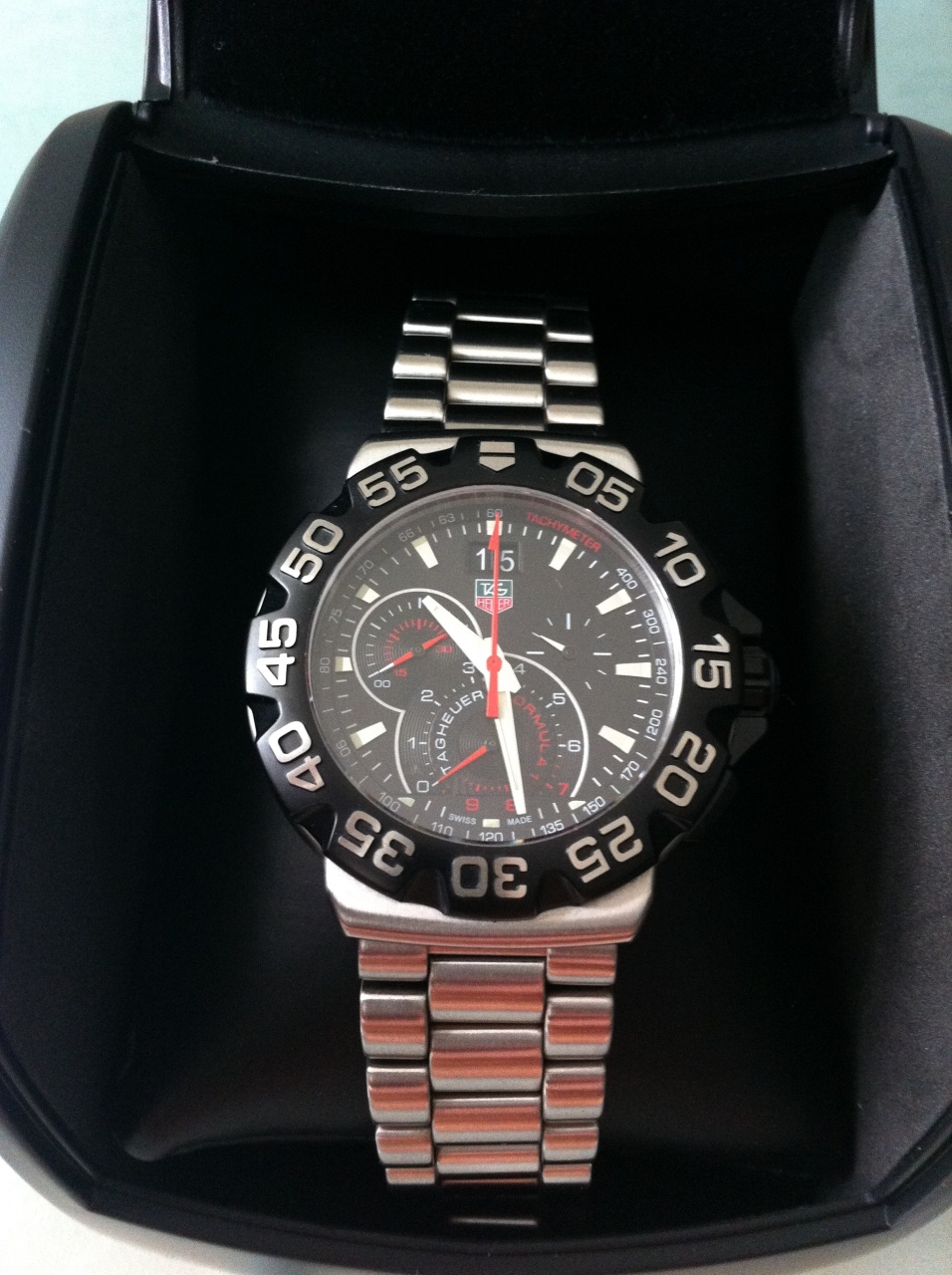 Formula 1 часы-хронограф с секундомером (точность 1/10 секунды) и тахиметром, наложенные вручную часовые метки. Вращающийся в одну сторону безель с устойчивым к царапинам титан-карбидным покрытием и полуматовыми рельефными цифрами. Завинчивающаяся заводная головка ''Easy Grip'' с титан-карбидным покрытием и полуматовым рельефным логотипом TAG Heuer. Задняя крышка с узором ''Стартовый флажок''. Застежка с двойной блокировкой с системой увеличения длины.