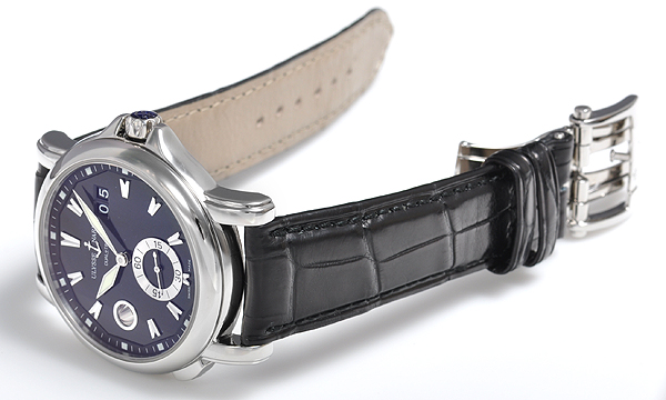 Уникальный механизм быстрой коррекции времени, индикатор постоянного «домашнего» времени, большой указатель даты. Фиксируемая на резьбе заводная головка.