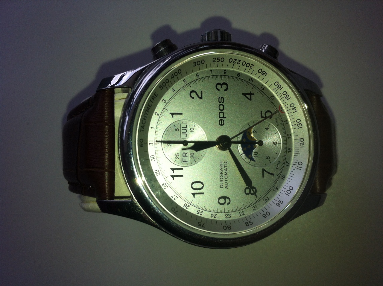 Продаются часы наручные мужские EPOS, коллекция Sportive, артикул: 3341.258.20.38.25 Механизм: механический с подзаводом (резерв хода 46 часов). Корпус: нержавеющая сталь (316L). Кожаный ремешок с фирменной клипсой (“баттерфляй”). Сапфировое стекло. Водозащита: 50М. Габариты: 42,6х15,5мм Хронограф с дуографическим циферблатом, лунный календарь, тахометр, указатель даты, дня недели, месяца, прозрачная задняя крышка. Часы высокого класса точности, механизм калибра Valjoux 7751, 25 камней. 2 года гарантии. Полный комплект (коробка и документы). Часы куплены в фирменном магазине в Москве в мае 2012г, практически не носились. Состояние идеальное.
