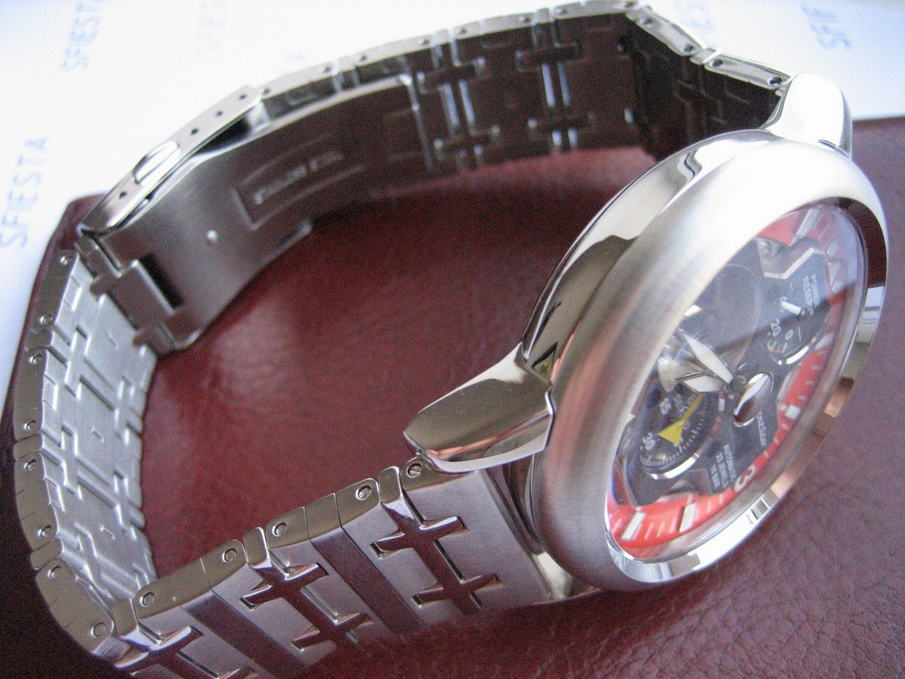 Теперь собственно о часах. Диаметр 44мм, толщина 14мм, вес 182гр. Не буду перепечатывать каталожные описания серии Retro-Future, скажу лишь что часы ОЧЕНЬ классные. Приятно тяжёлые, даже массивные, и я буду смотреть на них не только чтобы узнать время, вернее не для того чтобы узнать время, а для удовольствия. Выгнутый сапфир интересно смотрится вкупе с пимпочкой (кстати, она коим-то образом вплавлена в стекло) на верхушке. Обратная сторона - тоже сапфир. Кстати, из всей линейки Retro-Future, часы Airplane единственные с сапфировым стеклом, остальные с минеральным. Гордая надпись «Сделано в Японии» - приятно. Браслет и фрезерованная застежка - тоже заслуживают отдельных слов – все подогнано четко и без лишнего люфта, не гремит и не клацает. Вот размер браслета мне явно великоват – думаю придётся убрать одно-два звена либо срочно потолстеть.