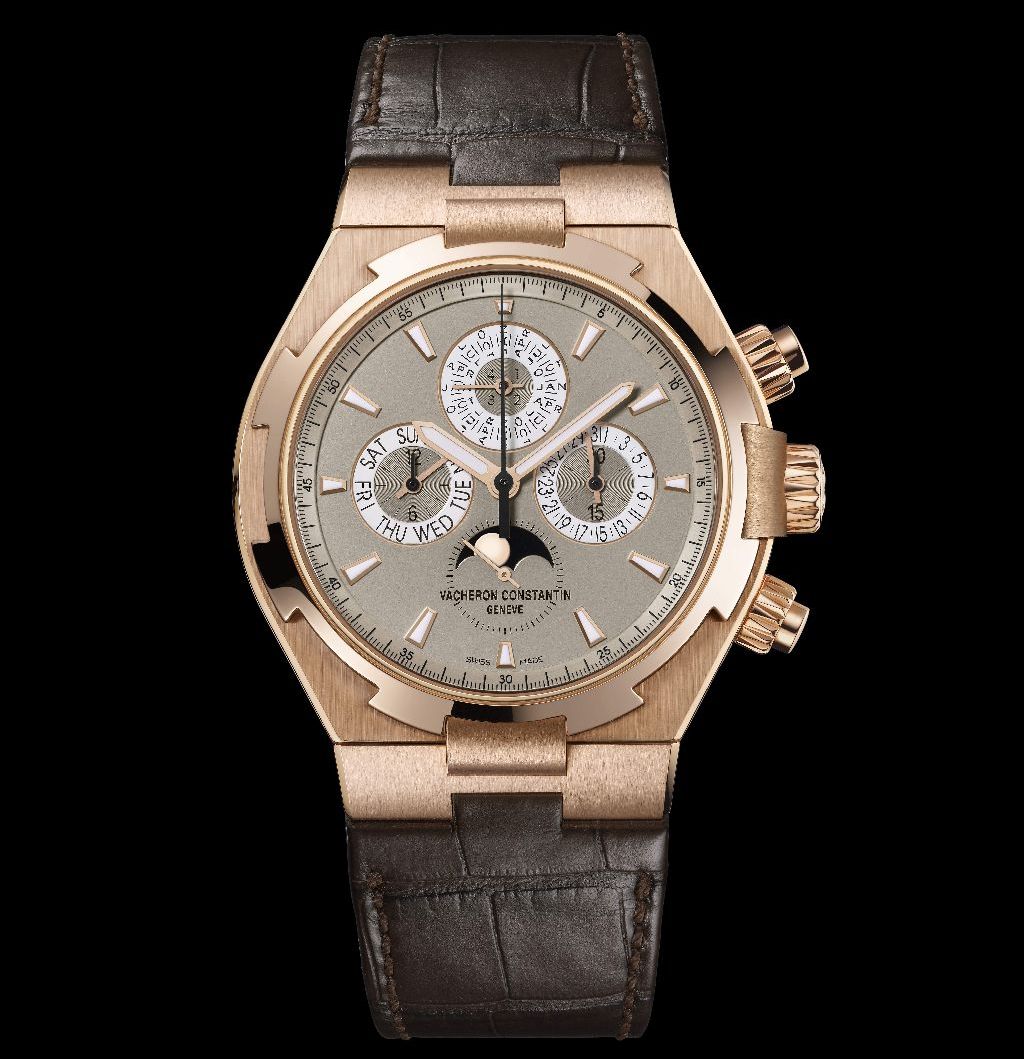 Новая модель Overseas Chronograph Perpetual Calendar (Ref. 49020/000R-9753) с вечным календарем и хронографом от швейцарского часового бренда Vacheron Constantin имеет корпус из 18-каратного розового золота, диаметром 42 мм, водонепроницаемый до 150 метров. Фиксированный фигурный "фирменный" полированный безель, скошенные края, завинчивающиеся заводная головка и кнопки хронографа, расположенные, соответственно, на 3, 2 и 4 часах. На задней крышке выгравирован медальон "Overseas" с изображением парусного корабля Америго Веспуччи. Сапфировое стекло защищает циферблат ветло-серого цвета, с накладными часовыми индексами и стрелками, изготовленными из 18-каратного розового золота, покрытыми белым люминесцентным составом.