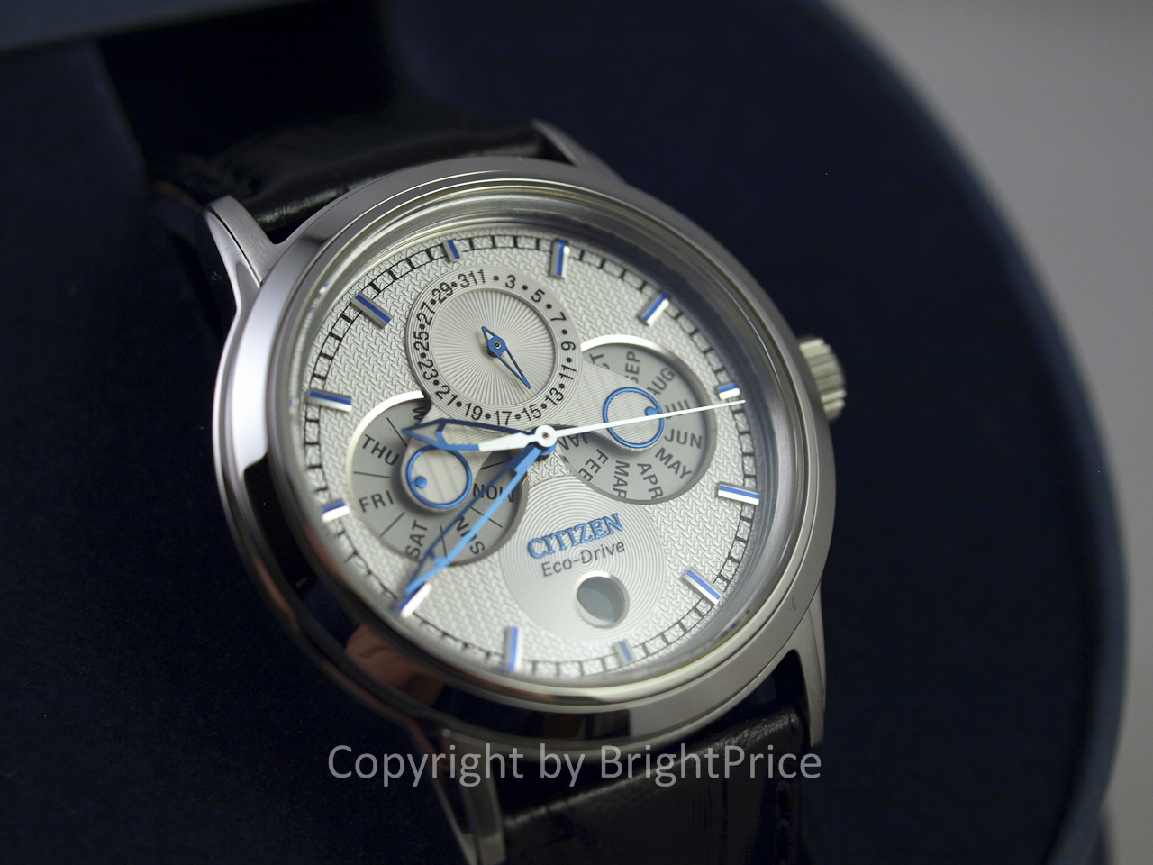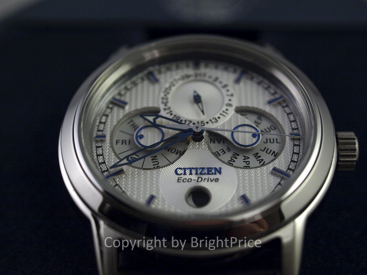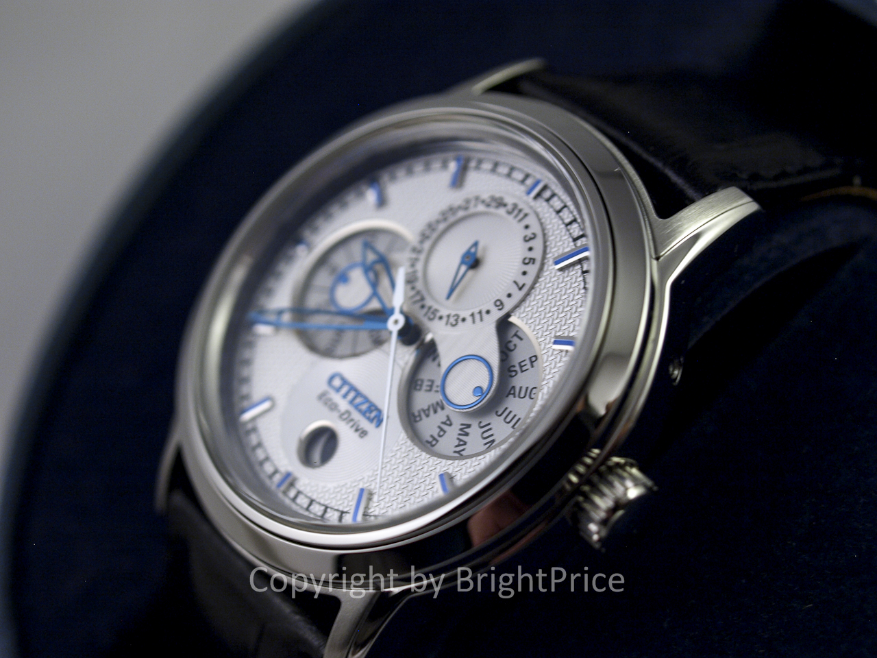 Калибр: Citizen 8730, Eco-Drive (заряжается от любого источника света), 180 дней резерва хода при полном заряде, лунный календарь, функция останова секундной стрелки;
