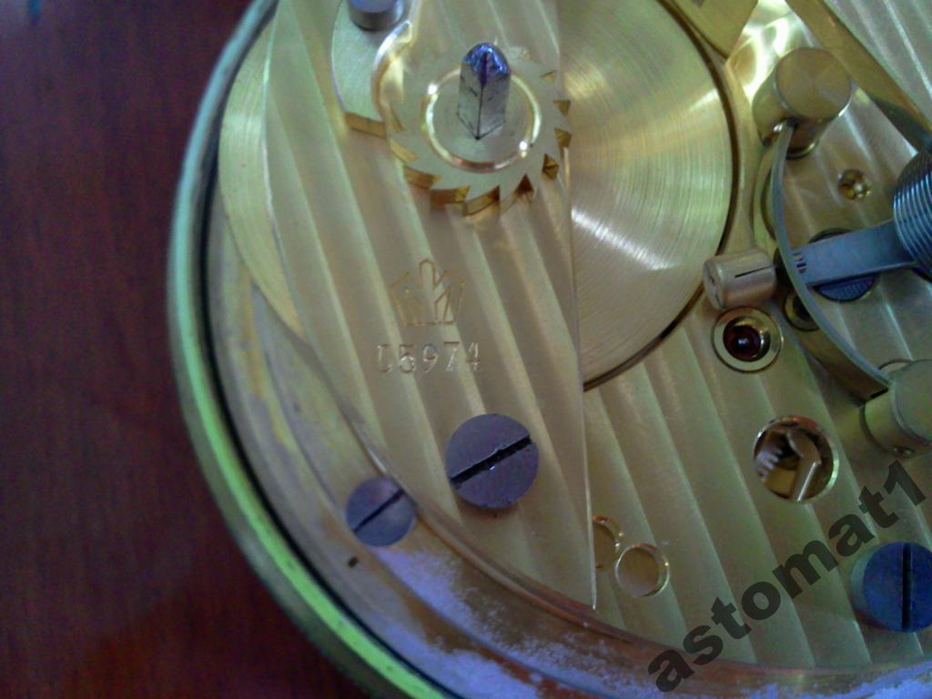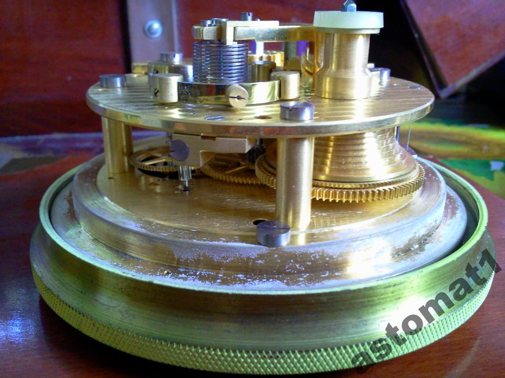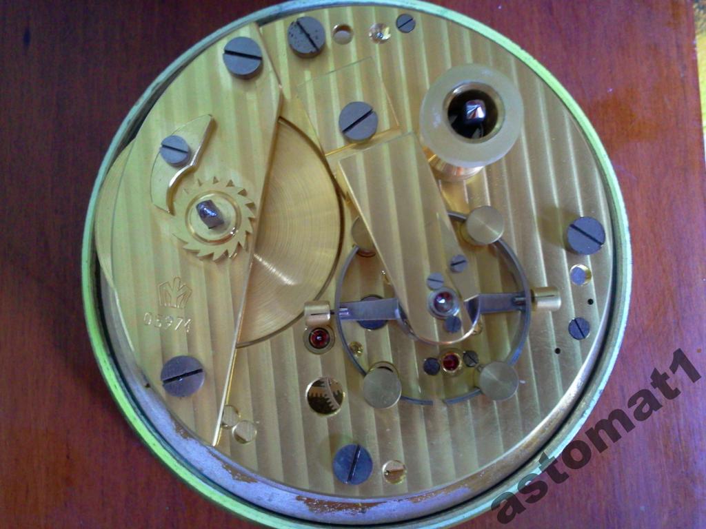 МЕХАНИЗМ ЧАСОВ НА ЗОЛОТЫХ ШАТОНАХ И КАМНЕ МОСТА БАЛАНСА ИЗГОТОВЛЕННОГО ИЗ НАТУРАЛЬНОГО АЛМАЗА, Хронометр с контактным устройством, посадочным диаметром платины 85мм, на 20 камнях и с компенсационным балансом. Хронометр 6МХ используется при решении задач мореходной астрономии Описание хронографа морского: Хронометр 6МХ разработан специалистами Ордена Ленина 1-го Московского часового завода в 1947 году и предназначался для хранения точного времени в часах, минутах и секундах на кораблях и судах всех классов, типов и назначений. Морской хронометр экспортировался в Болгарию, Вьетнам, Германию, Польшу, Румынию, Финляндию, Чехословакию, Югославию, Японию, Италию, Америку и другие страны. Хронометр - уникальный механизм ручной сборки с хронометровым спуском на 20 рубиновых камнях и опоре баланса из натурального алмаза. Хронометр установлен в футляр и ящик, изготовленные из дерева твердых пород с лаковым глянцевым покрытием под цвет красного дерева, либо, по дополнительному заказу, из красного дерева. Аналог морскому хронометру 6МХ выпускается только одной фирмой - Швейцарской фирмой Зенит. Морской хронометр 6МХ выставлен в Швейцарском музее часов в городе Шо-де-Фон. Морской хронометр 6МХ является обязательным оснащением в судовом реестре всемирно известной страховой компании Ллойда. Калибр механизма, мм - 85 Высота механизма, мм - 39.8 Количество камней в хронометре, шт. без контактного устройства - 15 с контактным устройством - 20 Период колебания баланса, с - 0,5 Продолжительность действия хронометра от одной полной заводки пружины, ч - 56 Средний суточный ход, wср, с - ±5,5 Максимальная вариация суточного хода D, с - ±2,3 Температурный коэффициент С, с/градус .±0,1 Масса комплекта, кг, не более - 9 Габаритные размеры, мм: во внутреннем футляре - 190х190х190 в наружном футляре - 320х260х234 О применении: В астрономии для измерения времени принимают звездные сутки – интервал времени между двумя последовательными верхними кульминациями точки Овна на одном и том же меридиане. Основой измерения времени в повседневной жизни служат средние сутки – интервал времени между двумя последовательными нижними кульминациями среднего Солнца на одном и том же меридиане. В судовождении подразделяют следующие системы счета времени: •всемирное (гринвичское); •местное (меридианное); •поясное; •декретное; •летнее; •судовое. Для определения места судна астрономическим способом время должно быть известно с точностью до «±0,5с».