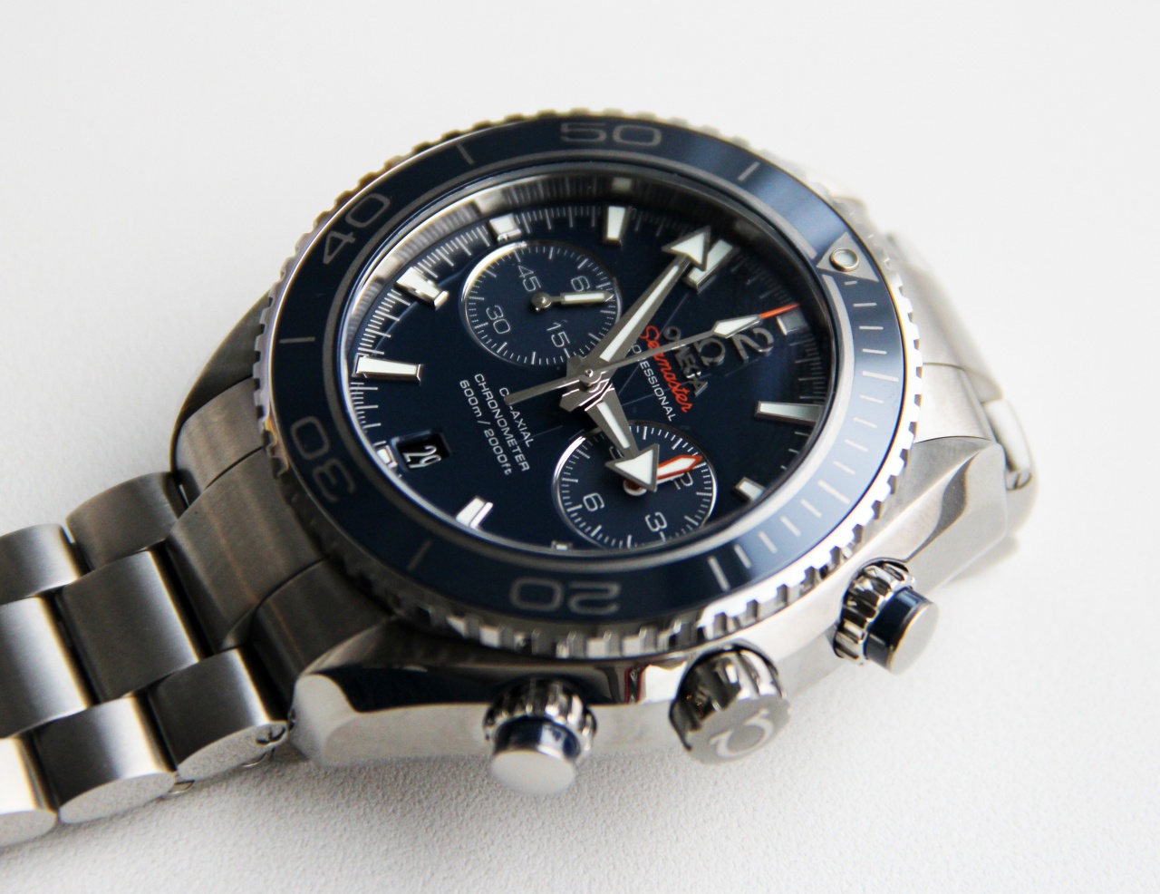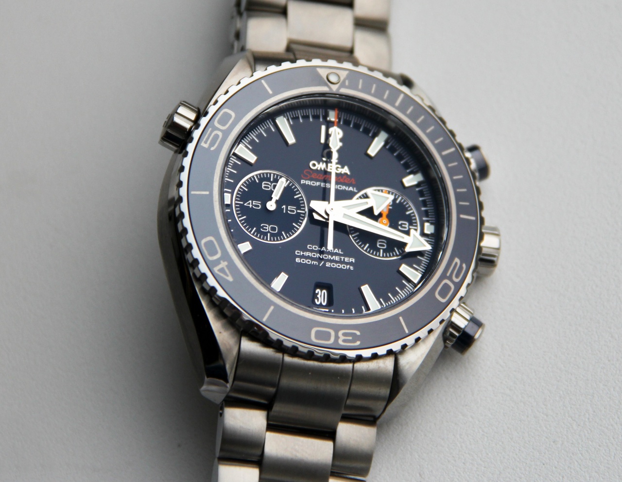 Что по часам? Когда берешь в руки титан, не имея в другой руке стального собрата, титан кажется достаточно тяжелым. Спичечный коробок, зажатый в кулаке, увеличивает силу удара примерно на 16 килограмм. Так что титановая Омега в этом плане тоже пригодится. К легкости достаточно быстро привык. Кстати сказать, хрон на весах выдал 177 грамм, а стальной трехстрелочник на браслете – 217. Синий ликвидный металл и циферблат оказался просто таки расчудесным в своей пестрожопости. Вот в одном ракурсе безель и цифер совершенно черные. А вот так ежели посмотреть – то серые. Ну а вот эдак – темно-синие. (Кстати, если смотреть на это дело через опустошающуюся бутылку текилы, то безель кажется вообще фиолетовым, а цифер - треугольным). Синий цвет - благородный, как раз под джинсы. Такой синий, который не голубой. Понятно написал? Титановый корпус и браслет тоже смотрятся более калейдоскопично, чем сталь. Цвет играет от ярко-полированного металла до серого. Несколько коряво, но снова понятно, я думаю. Котлетка торчит на руке достаточно комфортно для своей высоты.