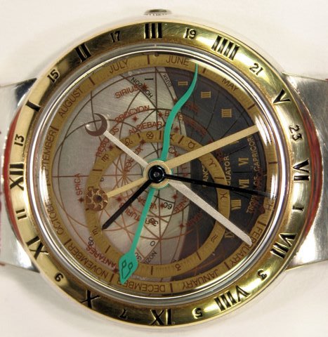 "Эта модель с аналоговым оформлением Григорианского календаря, представляет собой одни из самых сложных часов в мире. Стрелка солнца выполняет один оборот за каждые 24 часа и указывает: астрономическое солнечное время, восход и заход солнца, рассвет и сумерки, месяц, дату, знак зодиака, положение солнца, дни равноденствия и солнцестояния, стороны света и официальное время. Стрелка луны выполняет один оборот за каждые 24 часа 49 минут и указывает на циферблате и сетке: восход и заход луны, фазы луны, положение луны и стороны света. Сетка представляет собой диск на циферблате, состоящий из внешнего кольца (экватора) с месяцами, и внутреннего кольца, смещенного относительно центра (эклиптики), представляющей небосвод, разделенный на 12 знаков зодиака, и выполняющей один оборот за каждые 23 часа 56 минут и 4,1 секунды - в полном соответствии с современным Григорианским календарем: примерно за такой же временной промежуток совершает один оборот стрелка в виде змеи, обозначающая солнечные и лунные затмения, когда соответствующая стрелка оказывается в одном положении с ней"