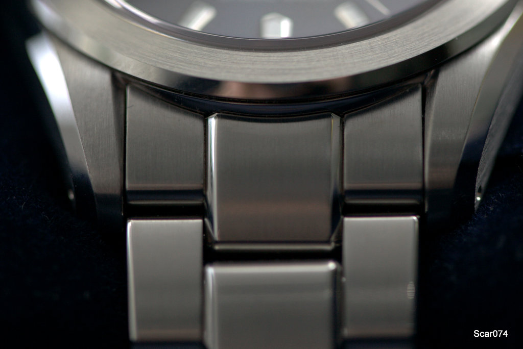 Браслет удобный, съемные элементы на винтах, все детали хорошо подогнаны друг к другу по размерам и зазорам. Корпус часов и браслет преимущественно матово сатинирован, с зеркально полированными боковыми гранями. Интересный эффект - с звеньев браслета как будто сняты полированные фаски. В целом чередование матового сатинирования и полировки выглядит красиво, на солнце блестит, но не навязчиво. Ощущение качественной и дорогой вещицы.