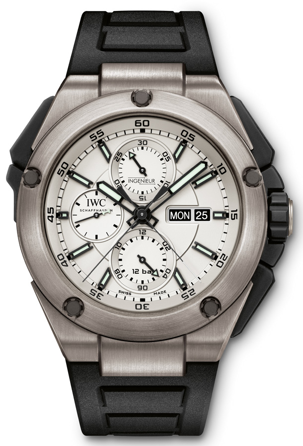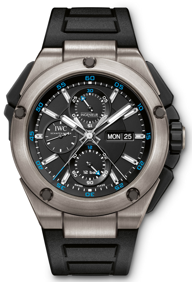 Несомненно, обращают на себя внимание новые элементы дизайна семейства Ingenieur. Место характерных технологических отверстий на ободке теперь занимают пять винтов, что идеально соответствует спортивному духу часов. Винты соединяют стекло циферблата с корпусом, состоящим из титана как в Ingenieur Double Chronograph Titanium (Ref. IW386501, IW386503), так и в Ingenieur Dual Time Titanium (Ref. IW326403). Данный материал компания IWC внедрила в свое производство в 80-х годах ХХ века, что стало открытием для часовой индустрии. Неудивительно, ведь уникальные химические и физические свойства титана говорят сами за себя. Он в два раза легче, чем нержавеющая сталь, устойчив к коррозии, обладает надежной защитой от магнитных полей и не раздражает кожу. Именно поэтому даже кнопки обеих моделей, заводную головку и ее защиту разработчики выполнили из титана, покрыв его слоем каучука.