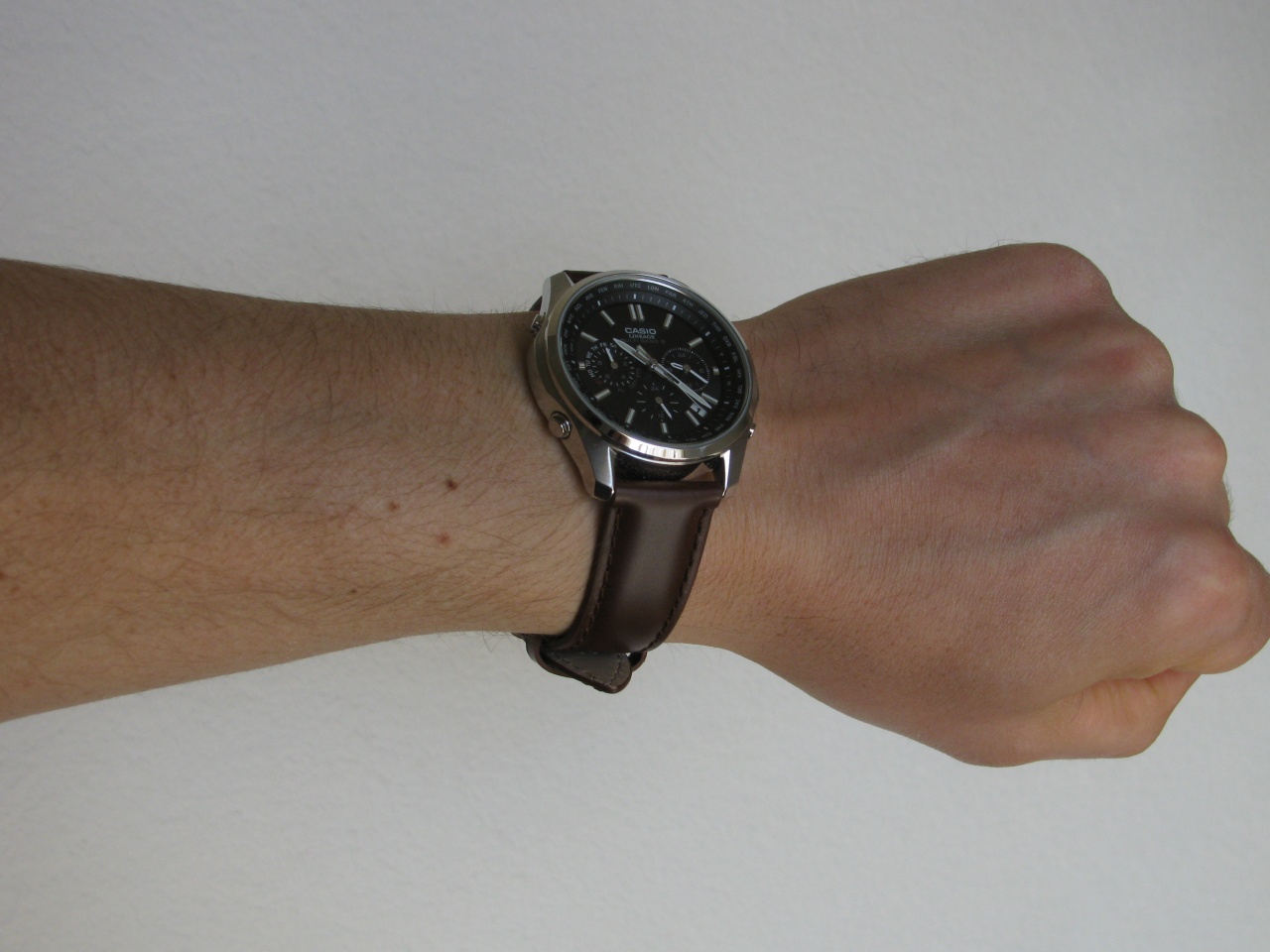 Не сложилось у меня в жизни с браслетами, поэтому первым делом поиграл с ремешками (в наличии были несколько нато и черная кожа). Пока остановился на черной коже, она правда не по размеру (22мм вместо 20), но нравиться больше других вариантов. Фотки прилагаются.