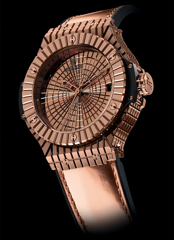Состоятельные клиенты смогут приобрести себе часы, безель которых украшен 42 белыми бриллиантами багетной огранки и крепится к корпусу на шести винтах из красного золота или титана, а для менее богатых клиентов Hublot предлагает аналогичные модели без бриллиантов.