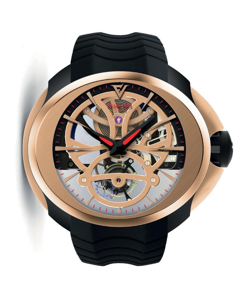 Корпус у новинки изготовлен из титана, диаметром 47 мм, водонепроницаемый до 100 метров. Фиксированный безель и вставки на корпусе - из 18-каратного розового золота. Сапфировое стекло установлено на передней стороне корпуса (с антибликовым покрытием) и на его завинчивающейся задней крышке. Циферблат, как таковой, отсутствует, на фланце прикреплены остроконечные часовые индексы. Обращают на себя внимание черные стрелки с алым люминесцентным покрытием. Модель оснащена мануфактурным скелетонизированным швейцарским механизмом с ручным заводом Franc Vila 8, на 17 камнях, с балансовой частотой 21600 полуколебаний в час (3 гц), запасом хода 5 дней. Мосты изготовлены из золотистого металла Lightnium (алюминиево-литиевый сплав, плотность которого вполовину ниже, чем у титана, а твердость - вдвое выше), спусковое колесо - кремниевое, балансовая пружина - плоская, регулировка баланса - винтовая. Функции индикации часов, минут (посредством соответствующих центральных стрелок). Турбийон расположен на 6 часах.