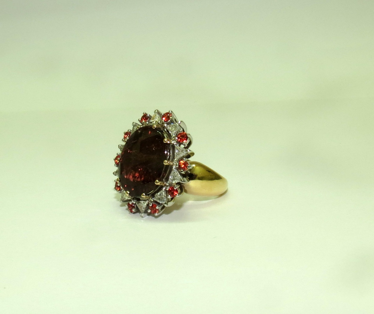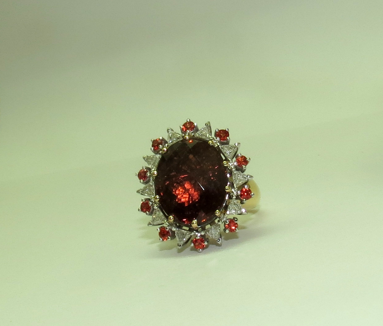Коктейльное кольцо турмалин 16 карат,10 треуг.брилл 1.1 кар