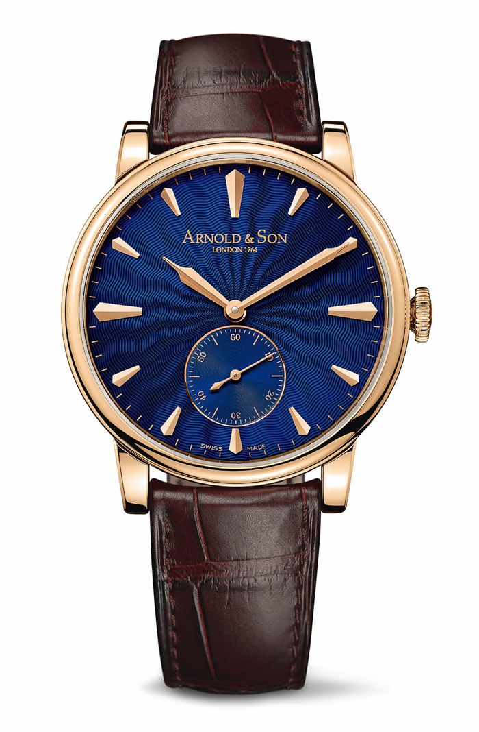 Новая модель HMS1 Royal Blue от британской часовой компании Arnold & Son, выпускающей свои часы в Швейцарии, имеет круглый полированный корпус, изготовленный из 18-каратного розового золота, диаметром 40 мм, водонепроницаемый до 30 метров. Рифленая заводная головка расположена на 3 часах. Сапфировое стекло установлено на передней стороне корпуса (выпуклое, с двусторонним антибликовым покрытием) и на его задней крышке. Циферблат гильошированный, покрытый полупрозрачным синим лаком, с накладными золотыми часовыми индексами и золотыми стрелками.