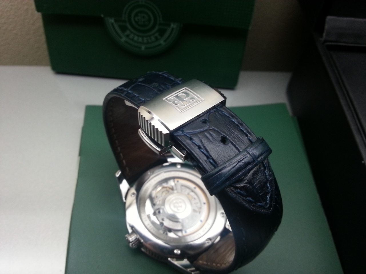 Часы полностью укомплектованы. Были в использовании немногим более года и находятся в прекрасном состоянии. Родной коричневый крокодил даже не одевался, сразу был докуплен темно-синий кроко, его и юзал. В целом отличные очень качественніе часы, не на эти деньги т.к. и на вид и на ощупь выглядят дорого.