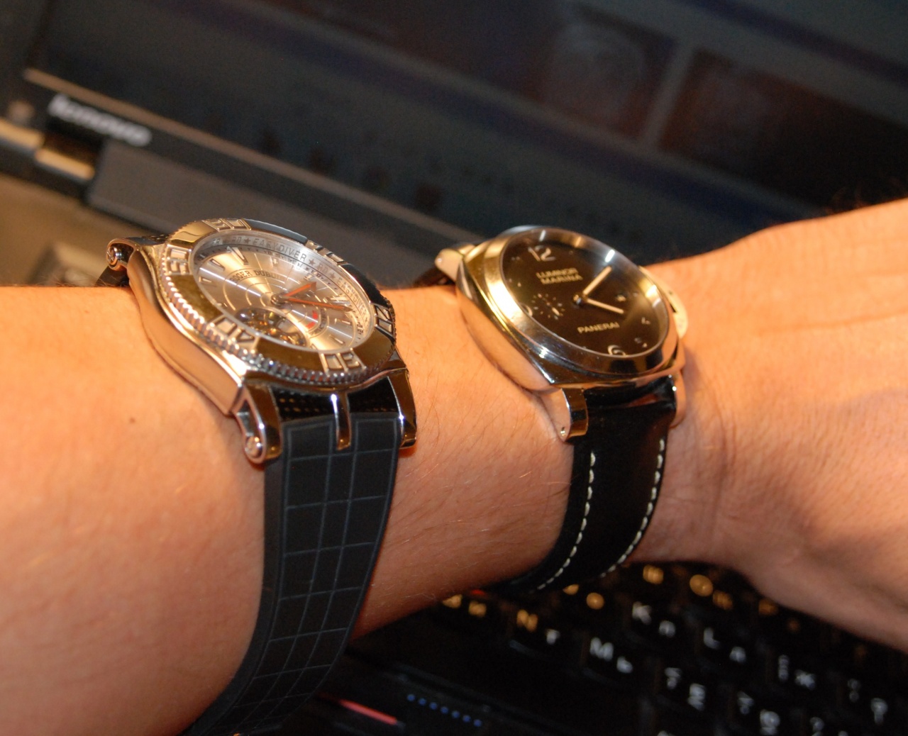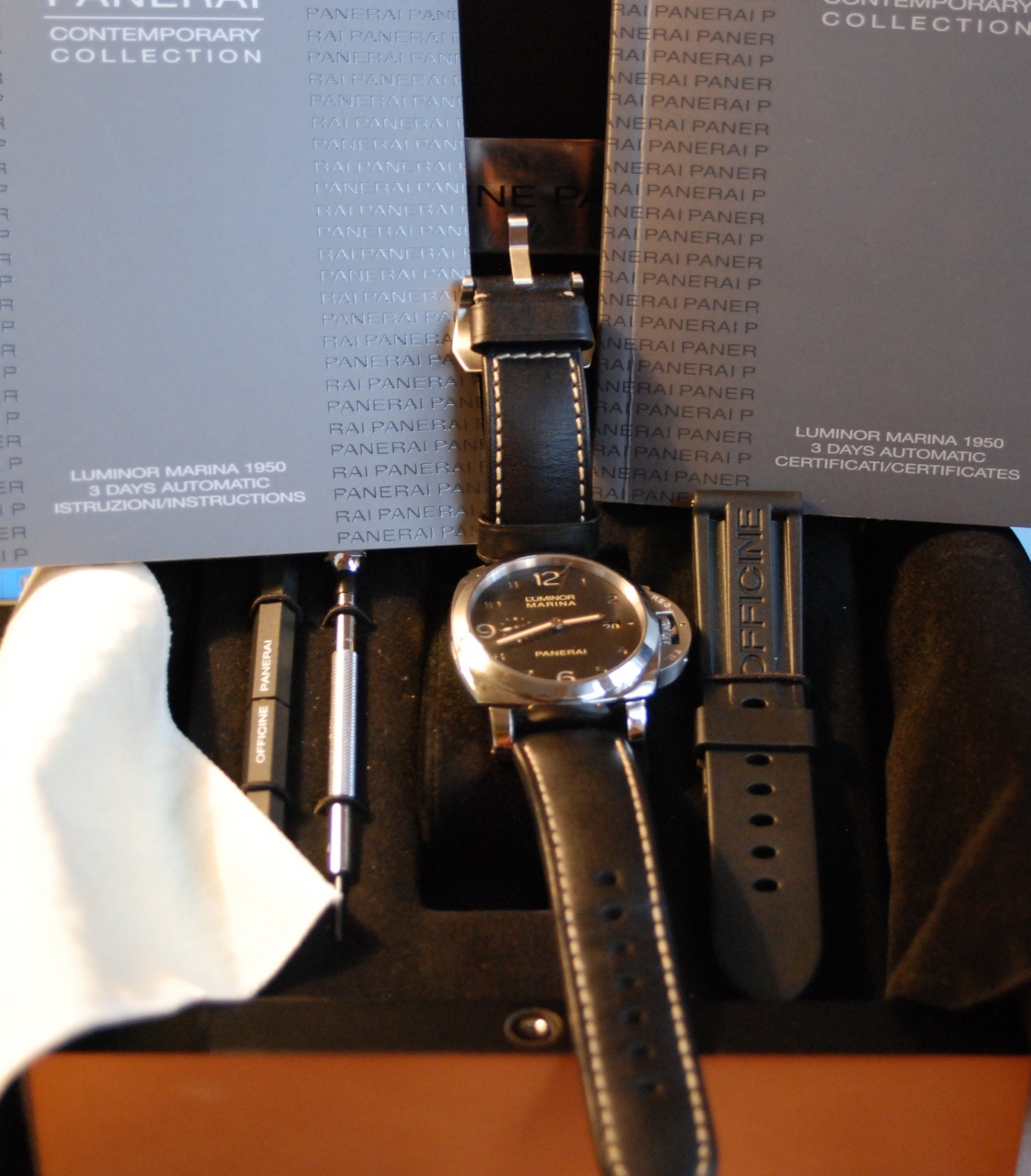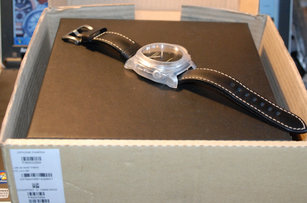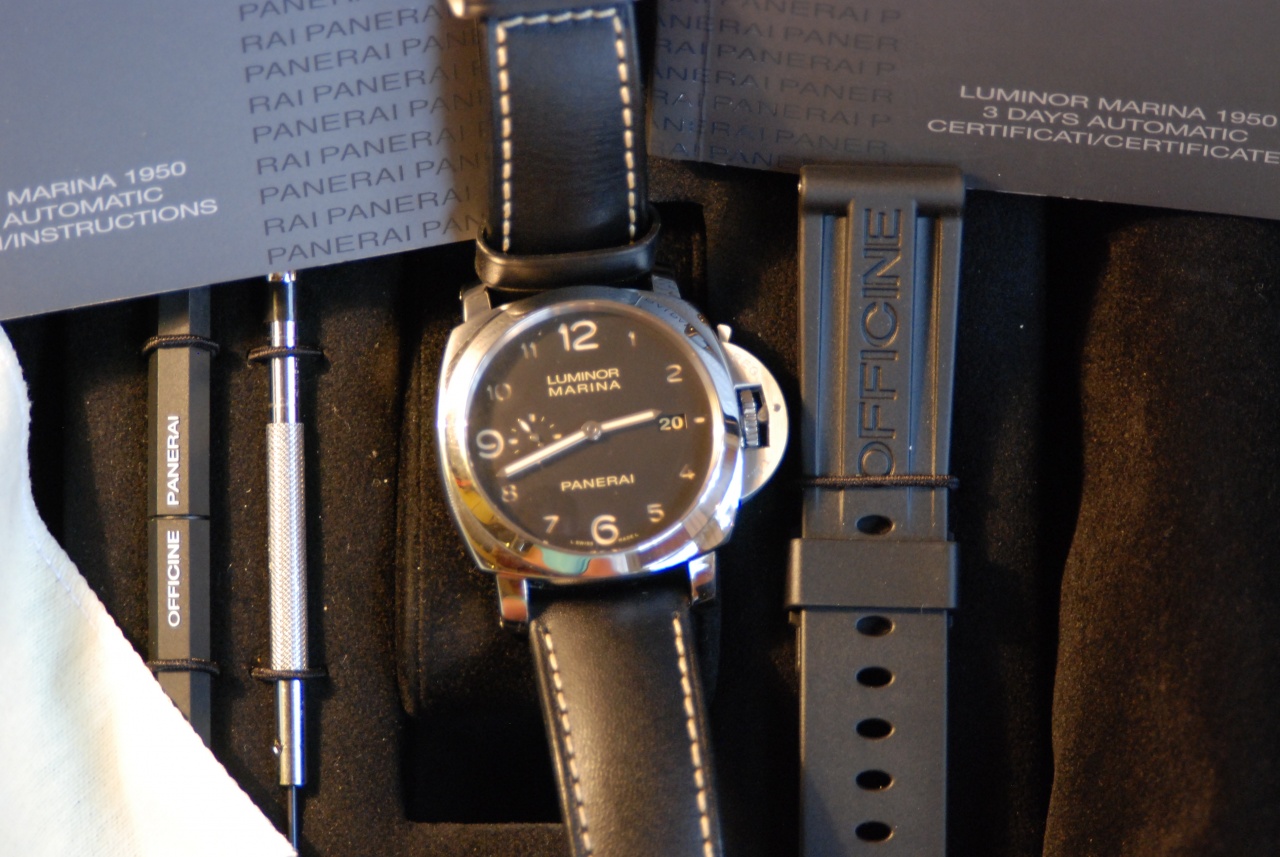 мануфактурный калибр с трехдневным запасом хода, выразительный массивный корпус, оригинальный ремень( цвет прострочки которого очень гармонирует с цветом цифр на циферблате) - все это способно порадовать не только адептов марки , но и людей, которые никогда не носили ПАНЕРАЙ!