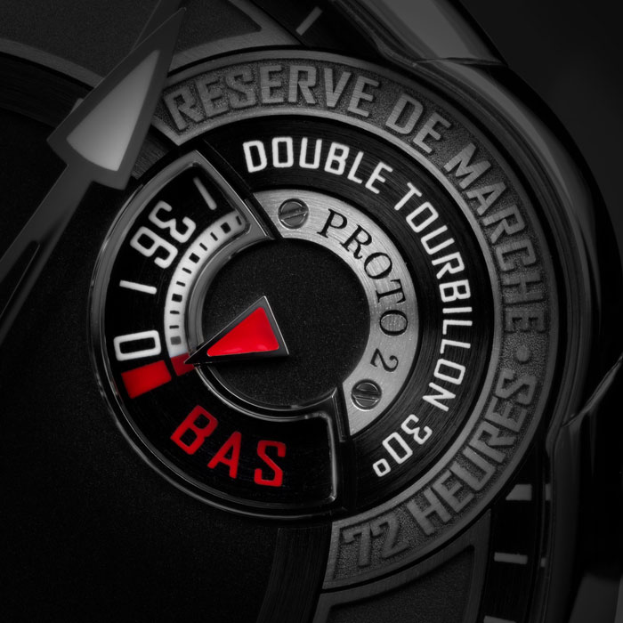 Инновационная индикация запаса хода осуществляется у отметки «2 часа». Вместо традиционной стрелки для индикации запаса хода в новой модели используется окошко с вращающимся внутри диском. Максимальный запас хода на 72 часа отображается треугольным индикатором красного цвета.