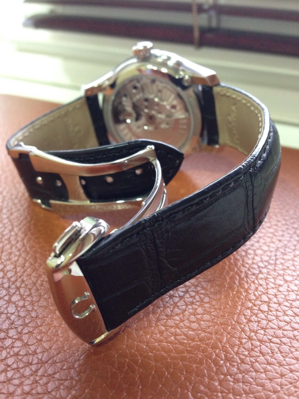 *Корпус стальной с сапфировыми вставками по бокам и сапфировым стеклом в задней крышке;