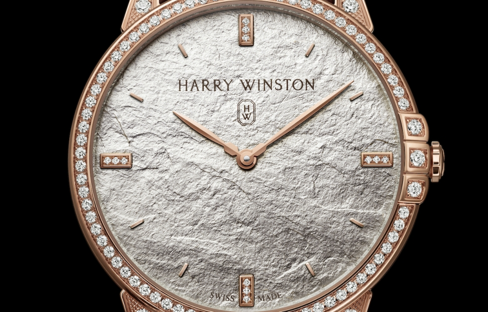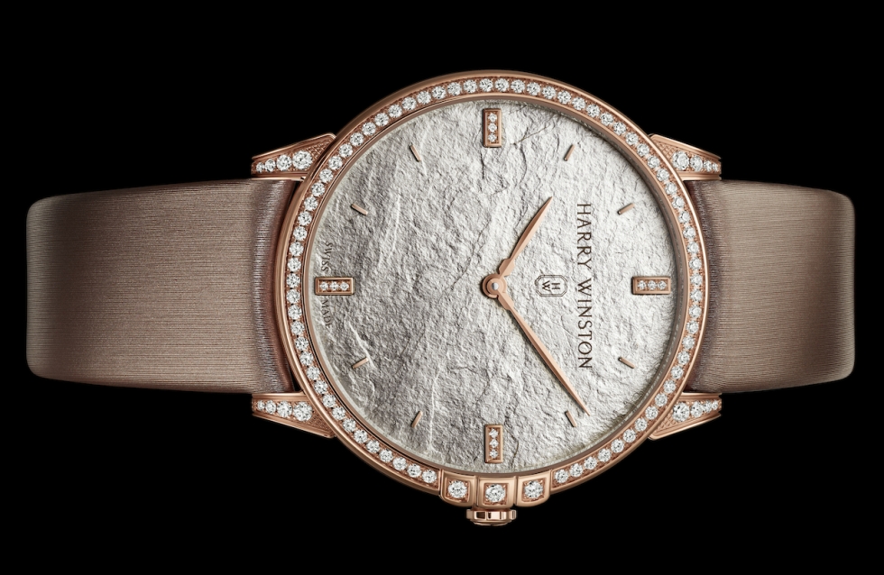 На создание новых моделей часов Midnight Monochrome дизайнеров марки Harry Winston вдохновила красота природного сланца. Можно было бы предположить, что именно этот материал и будет использован для создания циферблата, но нет: эффект сланца создает ... металл с эффектом сланца. А все потому, что в природе эта горная порода слишком хрупка и легко крошится и вырезать из нее даже такой небольшой по диаметру кусок, который требуется для циферблата, в целости и сохранности не представляется возможным.
