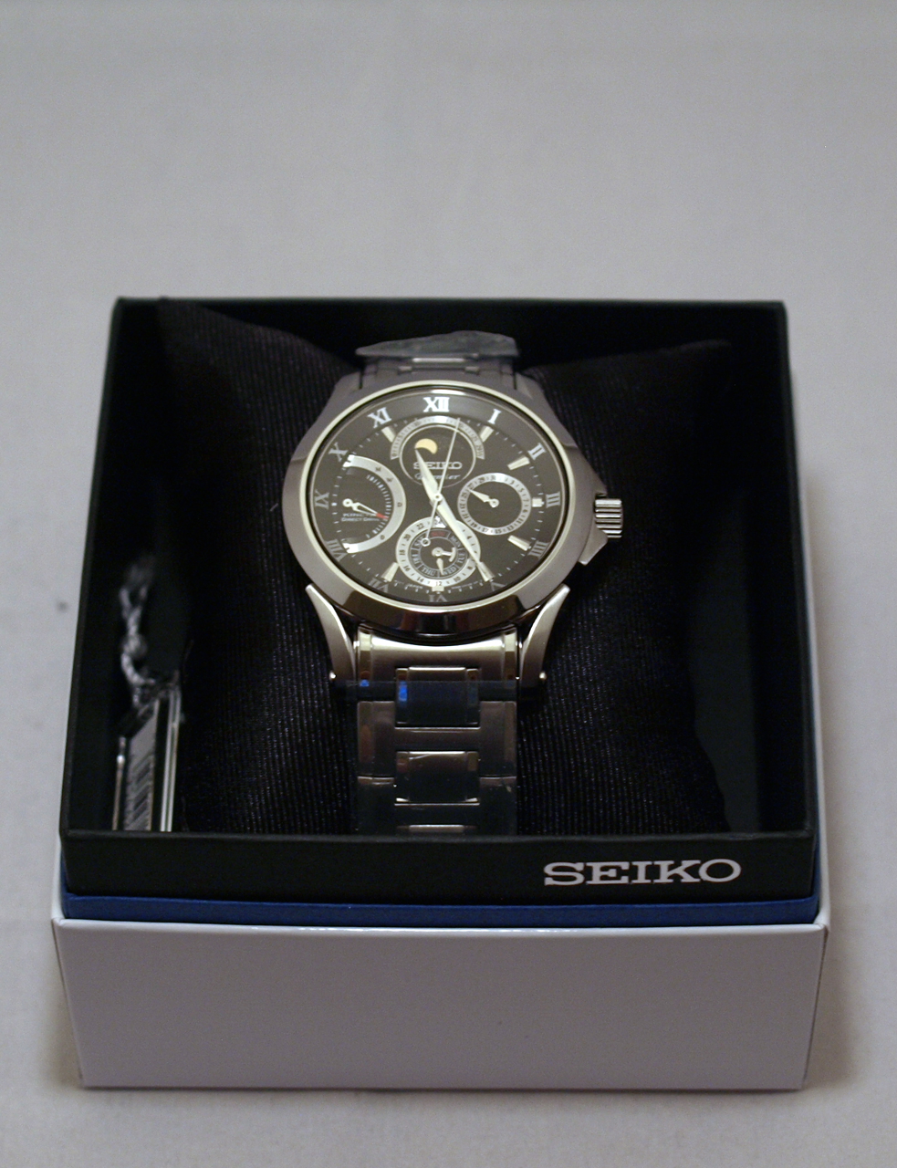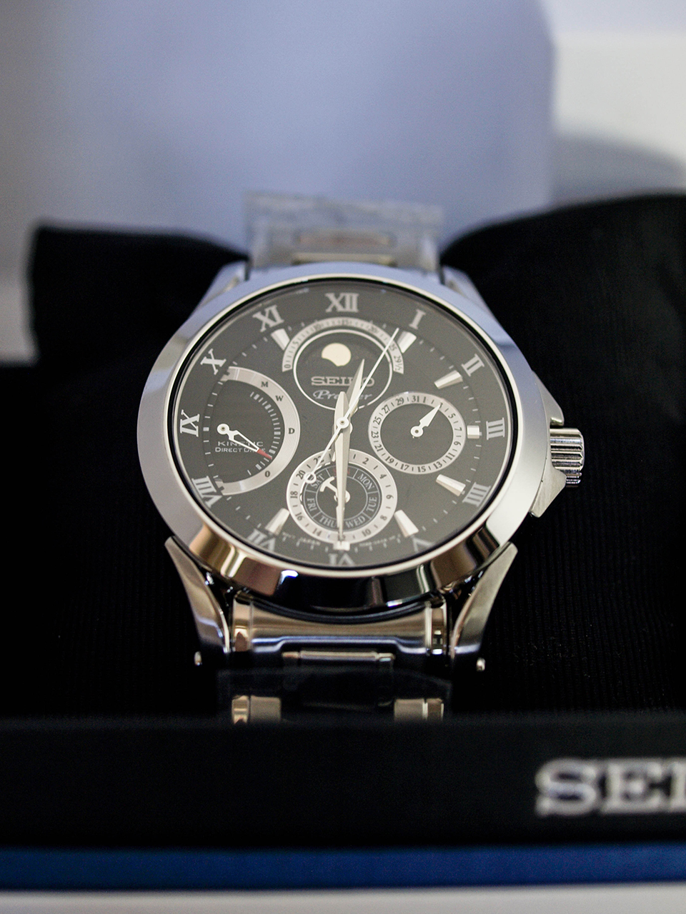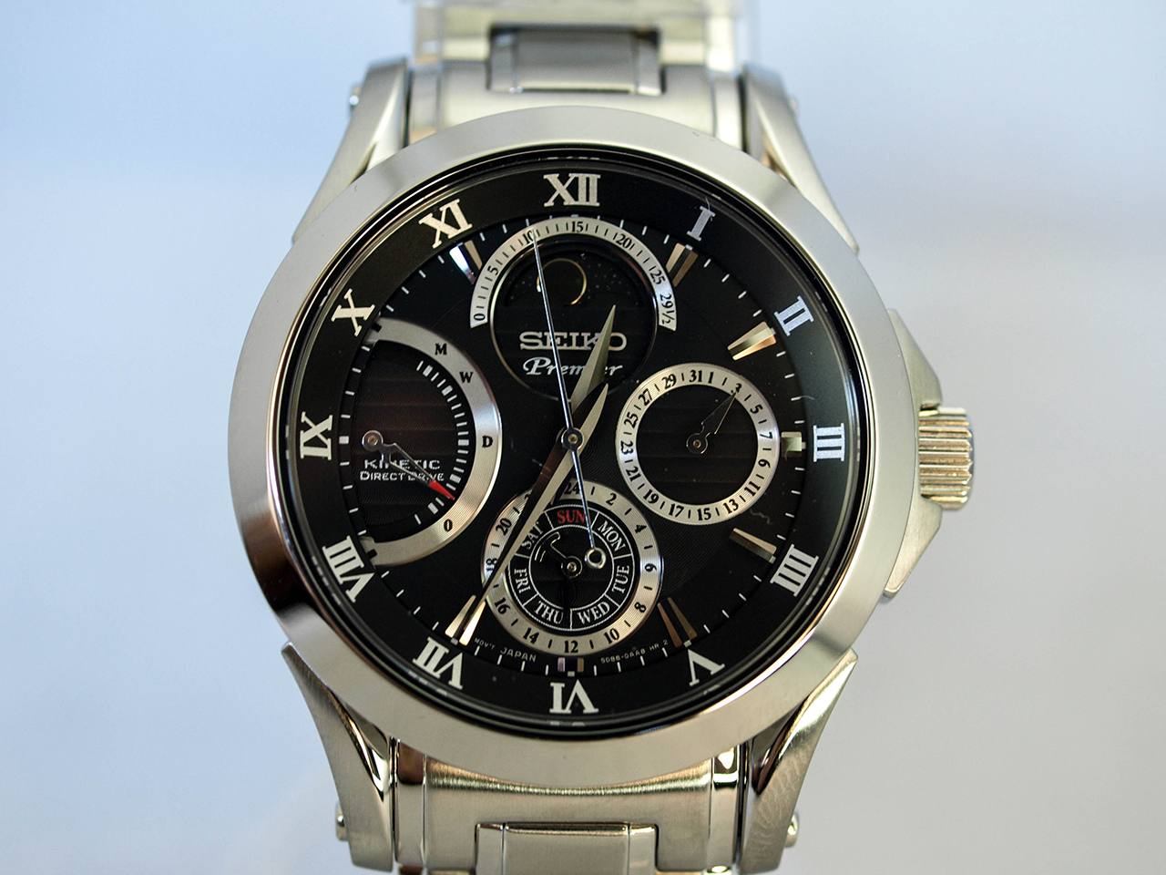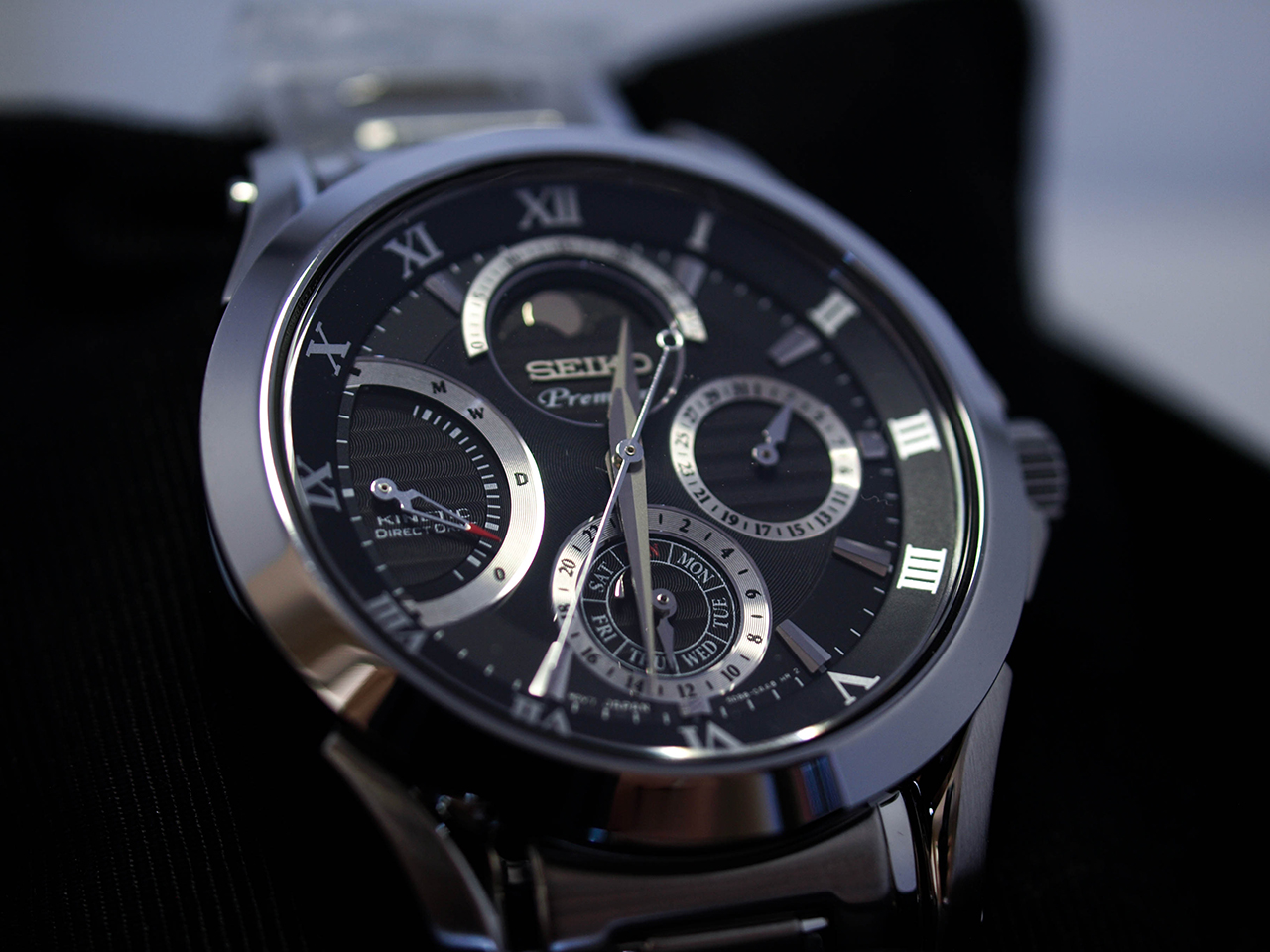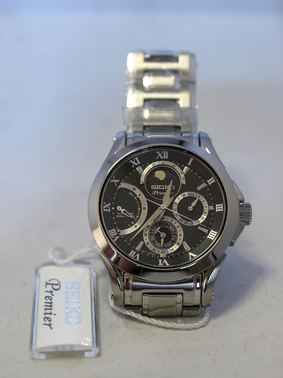 Представляю Вашему вниманию одну из топовых моделей серии Premier Kinetic Direct Drive от Seiko. Черный циферблат, стальной браслет на складной застежке, календарь, автоподзавод и возможность прямого завода с интерактивной индикацией уровня накопленной энергии, фазы луны - всё это собрано компанией Seiko в одной из самых модных моделей часов с рекомендованной розничной стоимостью в 1295 долларов.