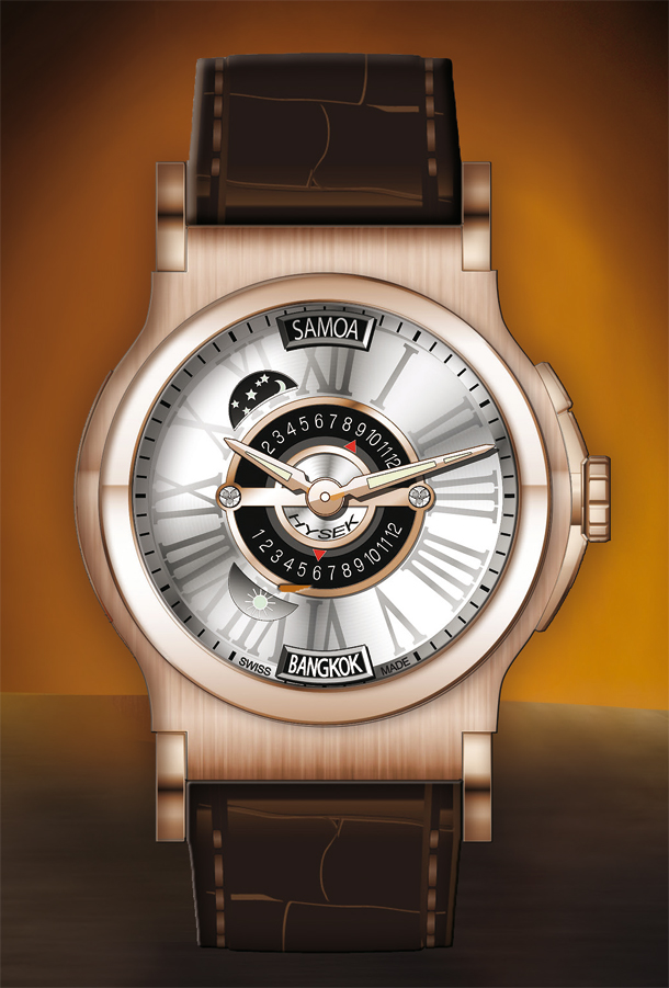 Индикация местного времени осуществляется с помощью центральных часовой и минутной стрелок, тогда как в верхней части циферблата арабскими цифрами от «1» до «12» представлено время второго часового пояса для городов, отображающихся в окошке в положении «12 часов».
