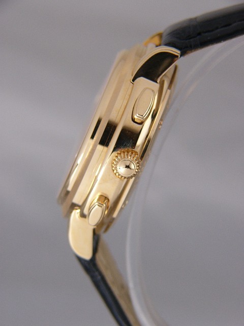 It has a 18K solid gold case, crocodile leather strap, crystal sapphire face, full working date/chronograph.