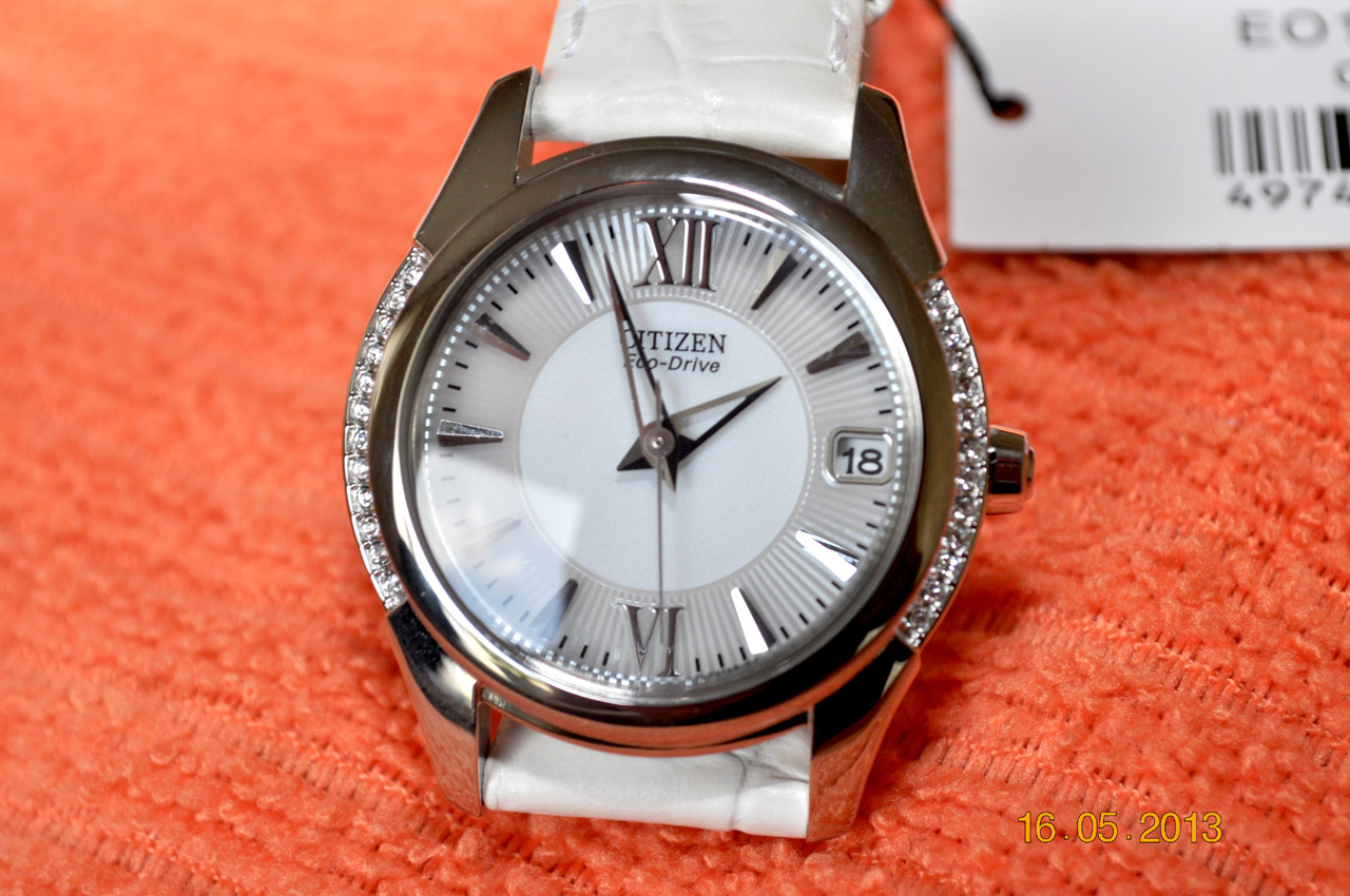 Представляю вашему вниманию фото женских часов со светлым цифером и кожаным светлым ремешком Citizen EO1041-03B Eco-Drive Ladies White Leather Swarovski Crystal Date Elegant Watch