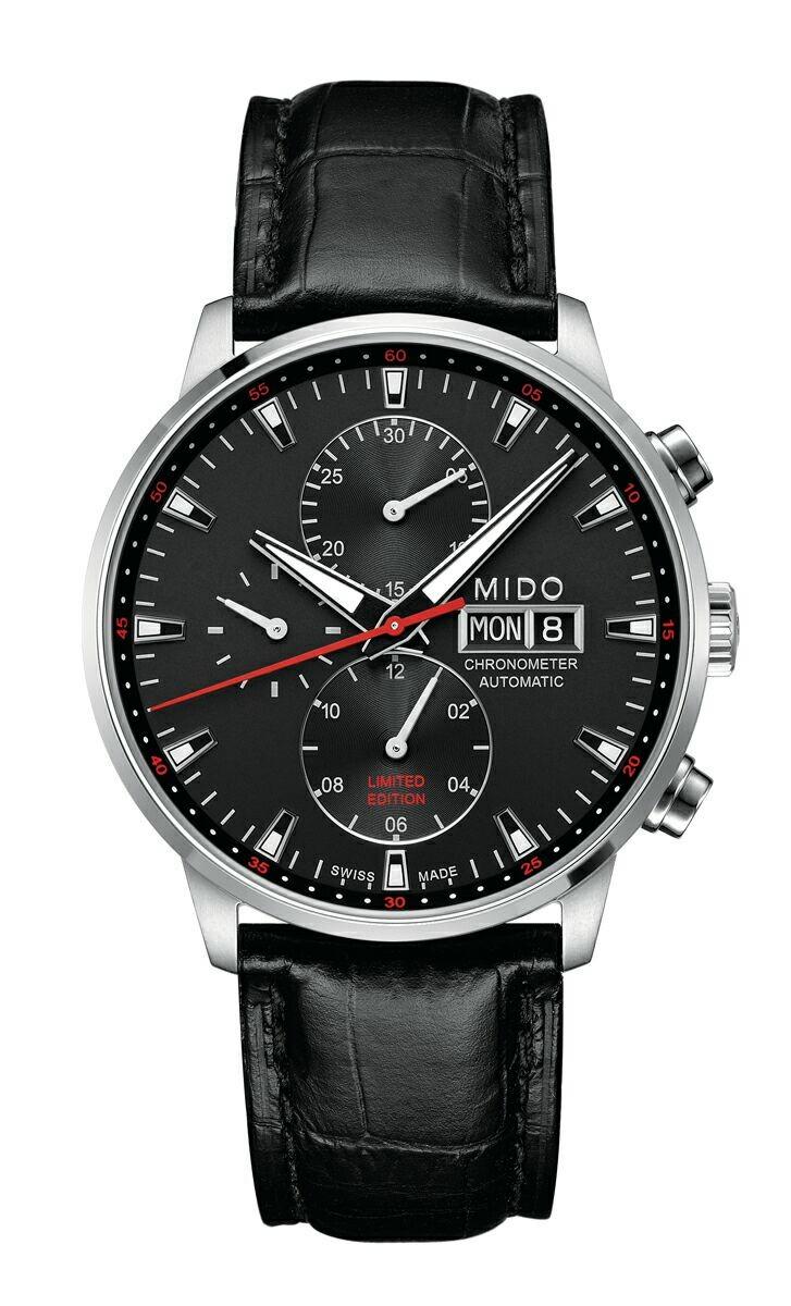 Новая модель Commander Chronometer Chronograph L.E. от швейцарской часовой компании Mido имеет круглый полированный корпус из нержавеющей стали, диаметром 42,5 мм, толщиной 16,5 мм, водонепроницаемый до 50 метров. Сапфировое стекло установлено на лицевой стороне корпуса (с антибликовым покрытием) и на его задней крышке. Циферблат матово-черного цвета с накладными часовыми индексами, покрытыми, как и часовая и минутная стрелки, люминесцентным составом белого цвета.