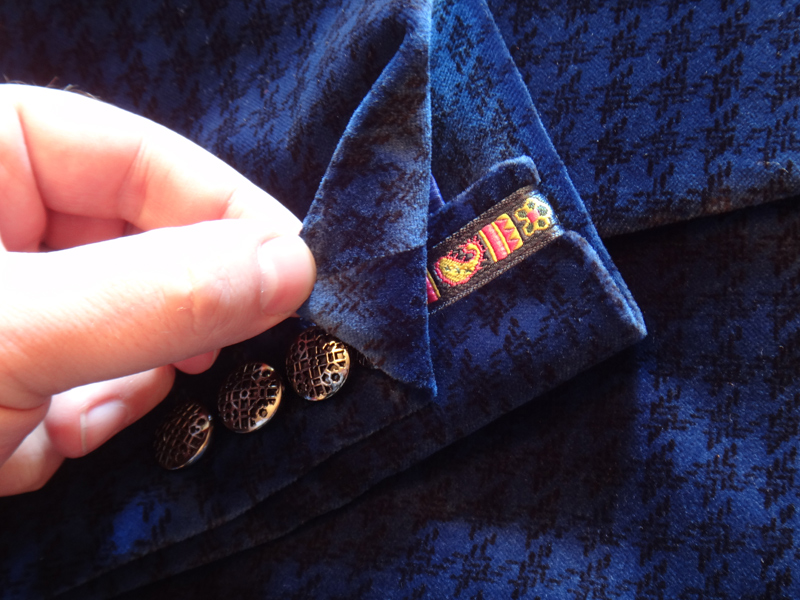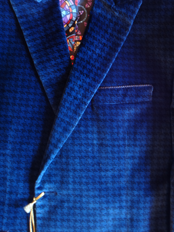Пиджак сделан из вельвета красивейшего темно-синего цвета, с узором Houndstooth (клыки). Вельвет абсолютно натуральный, 100% хлопок, никакого полиэстра! Материал бархатный на ощупь, играет на свету. Множество классных деталей (см. фото ниже).
