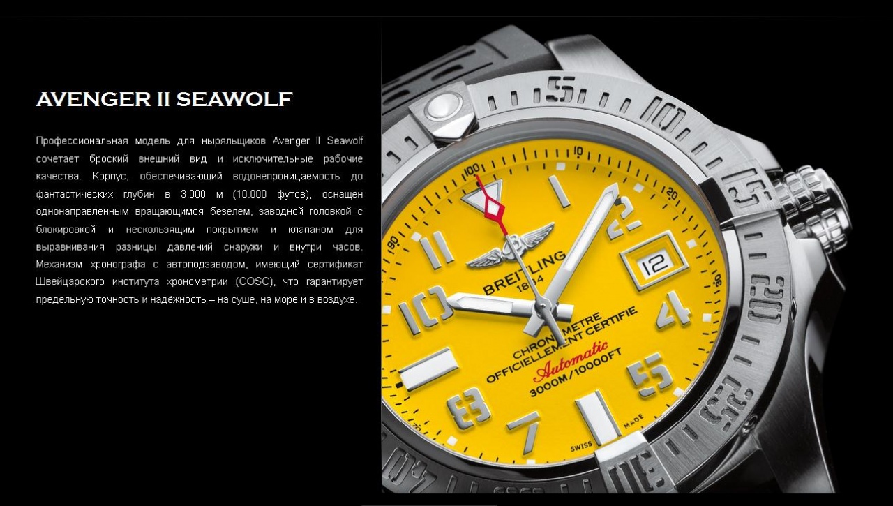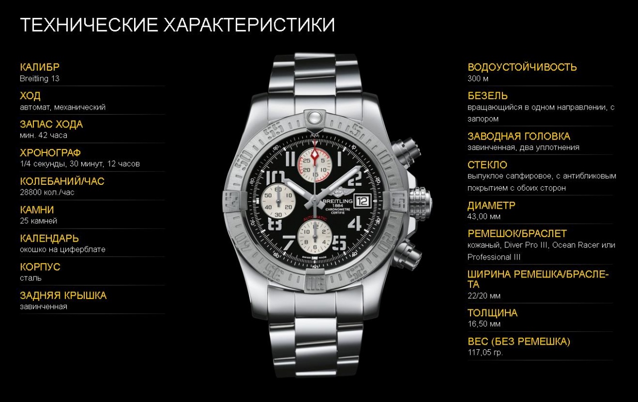 Серия Avenger была создана компанией Breitling, чтобы предложить покупателям максимальную надежность. Особо надежная конструкция с поперечными усилителями обладает максимальной ударопрочностью. Многофункциональность большой завинчивающейся заводной головки. Максимум читабельности благодаря утолщенному антибликовому сапфировому стеклу и увеличенным стрелкам, цифрам и часовым меткам.