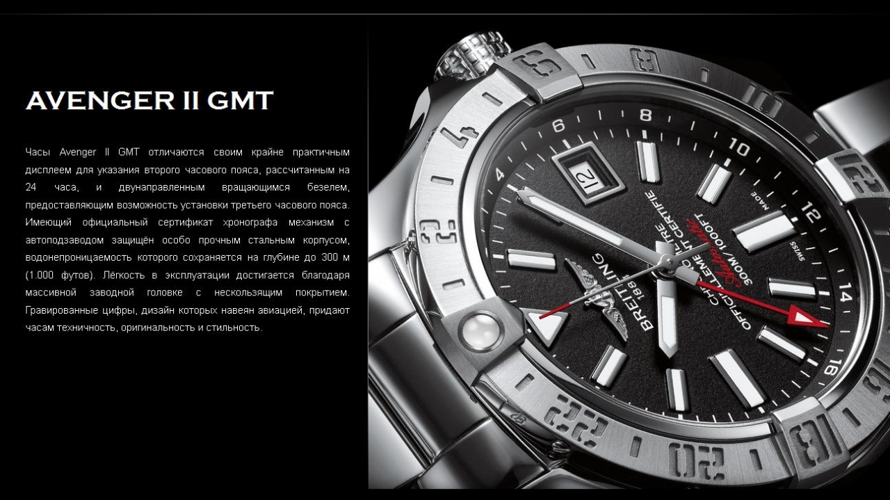 Новинка – Avenger II GMT отличается крайне практичным и удобным для восприятия индикатором времени второго часового пояса в 24-часовом режиме. Вращающийся в двух направлениях ободок позволяет снимать показания для третей часовой зоны. Модель водонепроницаема до 300 м.