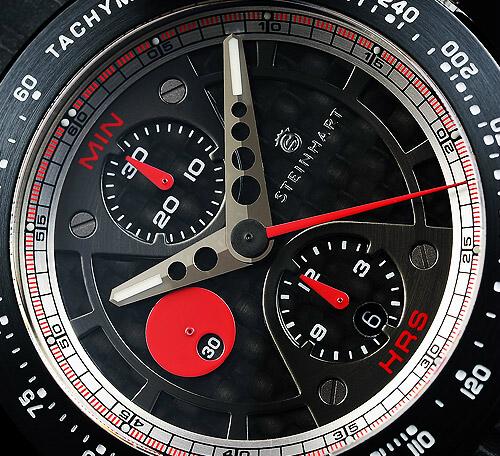 У новинки круглый корпус, изготовленный из нержавеющей стали, диаметром 45 мм, толщиной 16 мм, водонепроницаемый до 30 метров, с расстоянием между дужками 22 мм. На торце рифленой заводной головки, расположенной на 3 часах, выгравирован логотип бренда Steinhart. Пушеры хронографа расположены на 2 (красного цвета, в виде кнопки) и 4 (продолговатый, ребристый) часах. На фиксированном безеле, с черным DLC-покрытием, размещена круглая тахиметрическая шкала с разметкой белого цвета. Сапфировое стекло установлено на передней стороне корпуса (с антибликовым покрытием) и на его завинчивающейся задней крышке. Циферблат черно - серого цвета, выполненнный в стиле "сэндвич" с углеродным волокном; Часовые индексы, перфорированные часовая и минутная стрелки, с белым люминесцентным покрытием.