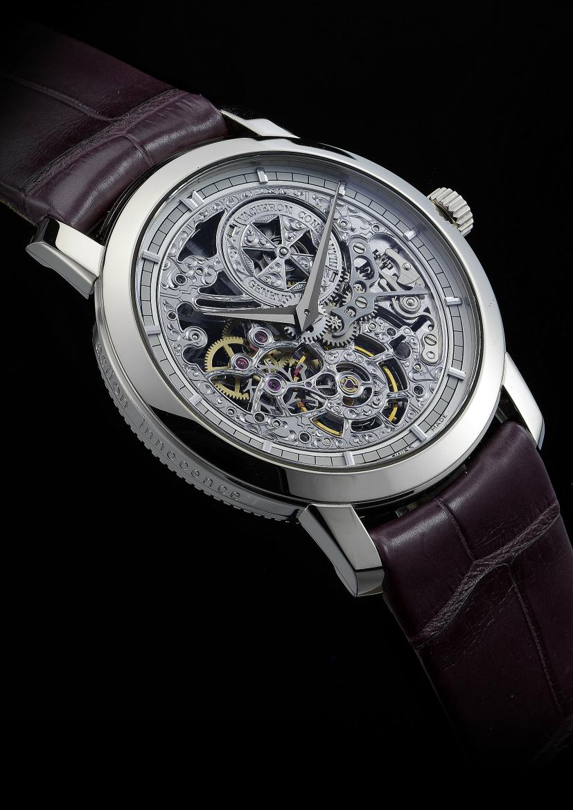 В этих красивейших часах из линейки Patrimony использован один из самых тонких мануфактурных механизмов - калибр 1003SQ. Этот скелетонизированный механизм декорирован в "Османском" стиле. На боковой поверхности корпуса выгравировано название "Action Innocence's".