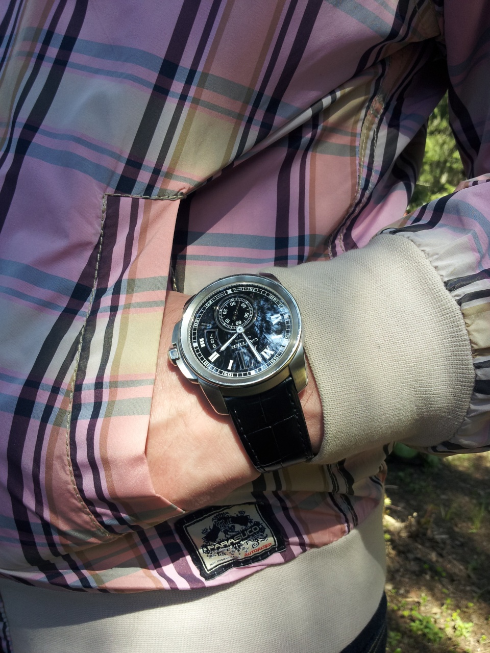 А если подумать о ремешке? Мне кажется на ремне выглядят более эффектнее и стильнее (примерял и на браслете, в итоге, остановился на ремне). Браслет придаст правда весомости (в смысле веса), так как сами часы достаточно легкие, на мой взгляд (на ремне 92-93гр).