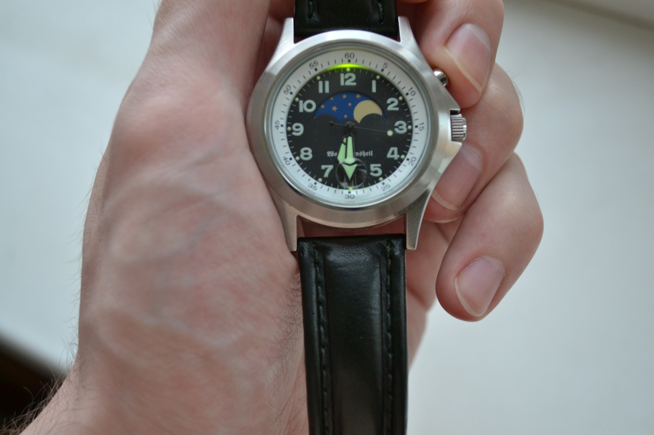 Особых требований, типа – сапфировое стекло, водостойкость до 200м и т.д. - не предъявлял. Важно было наличие люма на стрелках, а еще желательнее – подсветки (для охот в ночное время), а также – наличие лунного календаря, который позволяет определять степень освещенности во время охот ночью. Ну и, конечно, - кварцевый движок, чтобы не жалеть механику и не трястись за часы. Плюс – уверенность, что они не остановятся из-за возможного недозавода в неподходящий момент. Ну и, все же, – водозащита хотя бы до 50 м. Поясню – если придется опускать руки в воду по локоть – на мой взгляд – проще снять часы и положить в карман