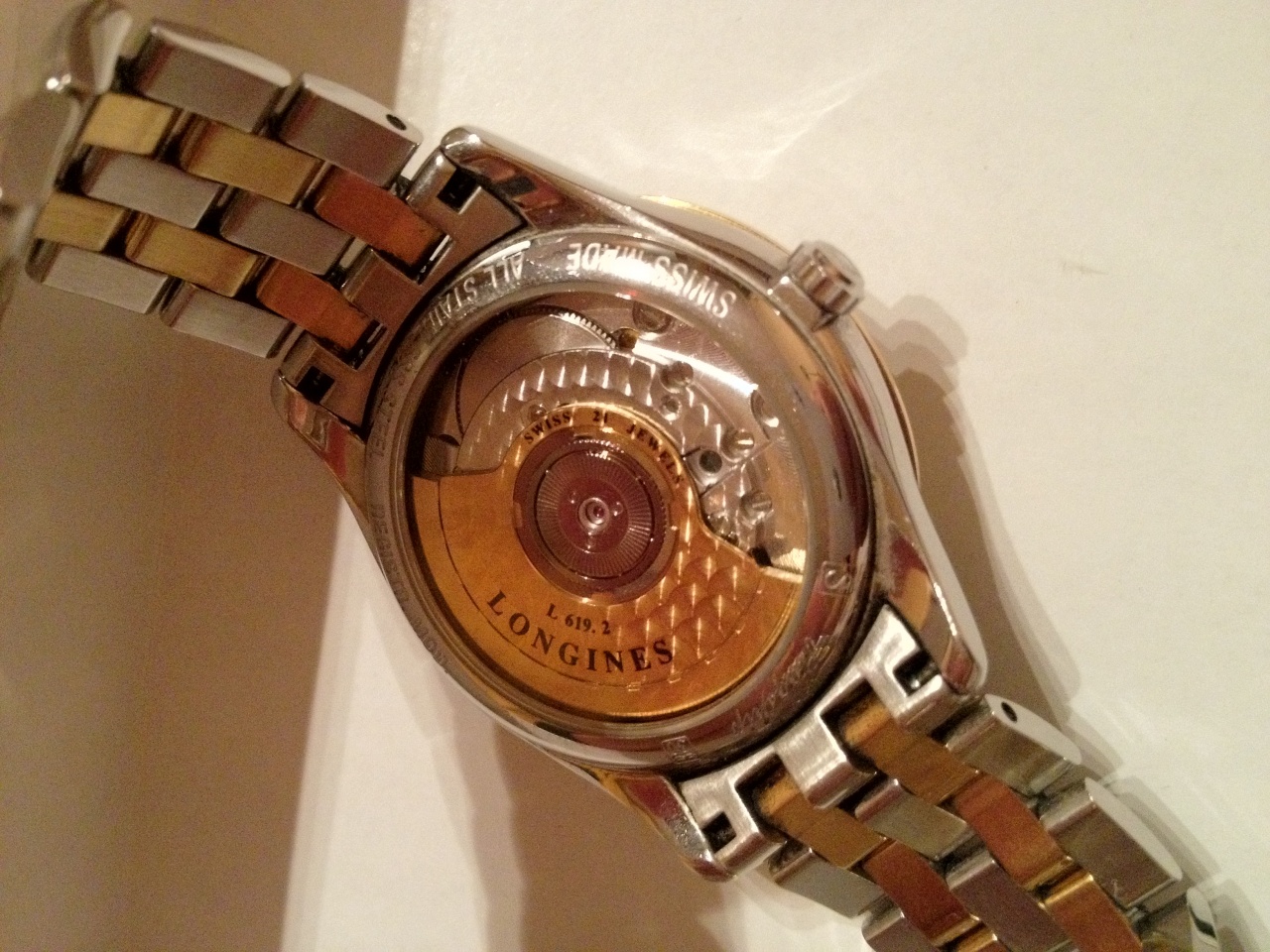 Longines Flagship. Механизм - автоматический. Диаметр корпуса - 36 мм. Индикатор даты. Прозрачная задняя крышка. Водостойкость 3 atm. Материал корпуса и браслета - сталь с PVD. Полный комплект с коробкой, документами и дополнительными звеньями браслета. На корпусе имеются незначительные потертости и царапины (см. фото). Во время обслуживания в 2009 г.была заменена спираль балансового колеса (сервис Eurotime).