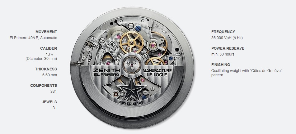 В 1969 году Zenith открывает новую главу в истории часового искусства благодаря своему калибру El Primero – первому автоматическому хронографу с интегрированным колонным колесом, который отличался исключительной частотой – 36 000 полуколебаний в час, обеспечивающей точность показаний до 1/10 секунды. Благодаря этим характеристикам он по сей день является самым точным хронографом серийного производства. Нет ничего удивительного в том, что Мануфактура Zenith приняла участие в организованном Министерством обороны Франции тендере по разработке часов для военных летчиков-истребителей, особенно если учесть, что она славилась своими часами для пилотов еще в начале XX века. Технические требования, на которые должны отвечать часы Мануфактуры, были строго определены: ей необходимо было создать модель, точность хода которой оставалась бы неизменной даже в самых экстремальных условиях эксплуатации: резкое ускорение от 9 до 11 g, изменение давления и температуры, вибрации и магнитные поля. Мануфактура превзошла себя и создала не имеющие равных по точности и прочности часы, которые соответствовали всем этим требованиям. В результате, в 1997 году на свет появилась модель Rainbow Flyback.