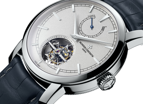 Модель Patrimony Traditionnelle с турбийоном и 14-дневным запасом хода из коллекции Excellence Platine оснащена Калибром 2260. Это механизм с турбийоном и ручным подзаводом, который обеспечивает невероятный запас хода — 14 дней. Помимо турбийона и маленькой секундной стрелки на отметке «6 часов», слегка смещенных минутной и часовой стрелок, на часах также есть индикатор, который показывает запас хода. Стрелка этого индикатора передвигается по круглой шкале на 280°. Такой объем шкалы превышает размеры классических индикаторов и позволяет разделить шкалу на 14 частей-дней, каждая из которых содержит два сегмента по 12 часов. Это позволяет получить максимально точную информацию об оставшемся заводе.