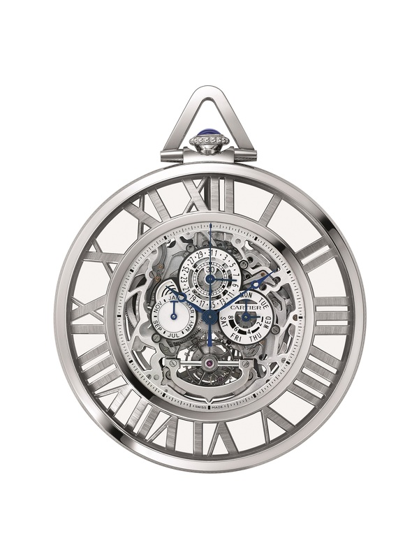 Иначе реализовали идею трансформации часовщики из Cartier. Их скелетонированные часы с вечным календарем, турбийоном, хронографом из карманных превращаются в настольные – прилагается специальный портик из обсидиана и горного хрусталя. Часы оснащены механизмом с ручным заводом 9436 MC с 8-дневным запасом хода. Круглый корпус диаметром 59 мм сделан из белого золота. Механизм окружен кольцом из римских цифр. Заводную головку венчает сапфировый кабошон. Скелетонированный циферблат украшают вороненые стрелки в стиле Бреге. Всего выпущено 10 экземпляров часов: пять в корпусе из белого золота, еще пять – в корпусах, инкрустированных бриллиантами.