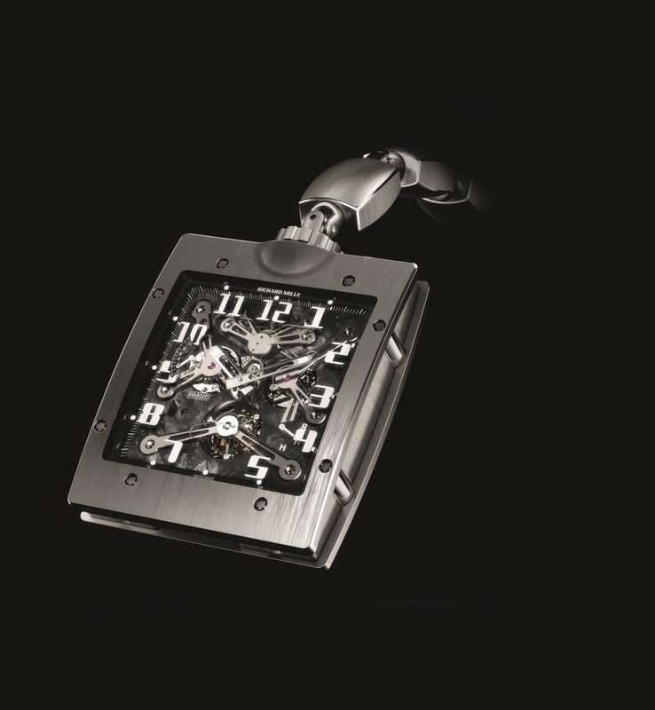 Имея собственный независимый взгляд на часовое дело, Ришар Милль выпустил карманные часы в титановом корпусе. Впрочем, отвечая современным требованиям и утверждая свою концепцию времени, марка Richard Mille идет дальше своих конкурентов и первой использует для платины углеродистое нановолокно, получаемое под высоким давлением при температуре +2000 °С, чья стабильность исключительна независимо от условий и температуры окружающей среды. Часы оборудованы переменным инерционным балансом, а два двойных барабана обеспечивают запас хода в десять дней. Опять же с помощью специальной подставки они превращаются в настольные часы.