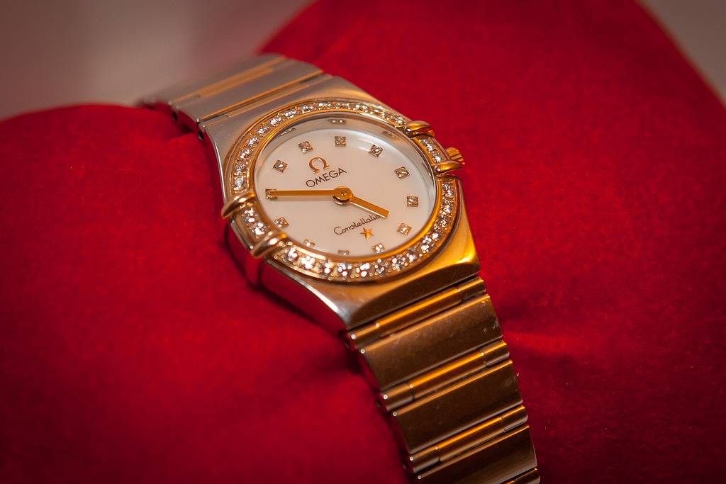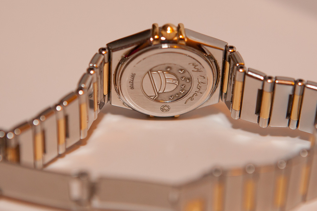 Женксие швейцарские часы знаменитой фирмы Omega, механизм кварцевый, корпус и браслет - золото 750 пробы и нерж.сталь, бриллианты.
