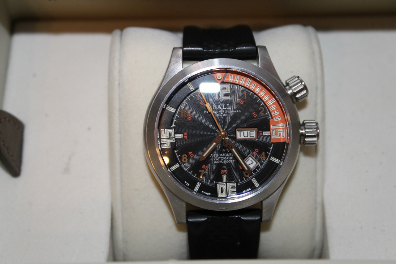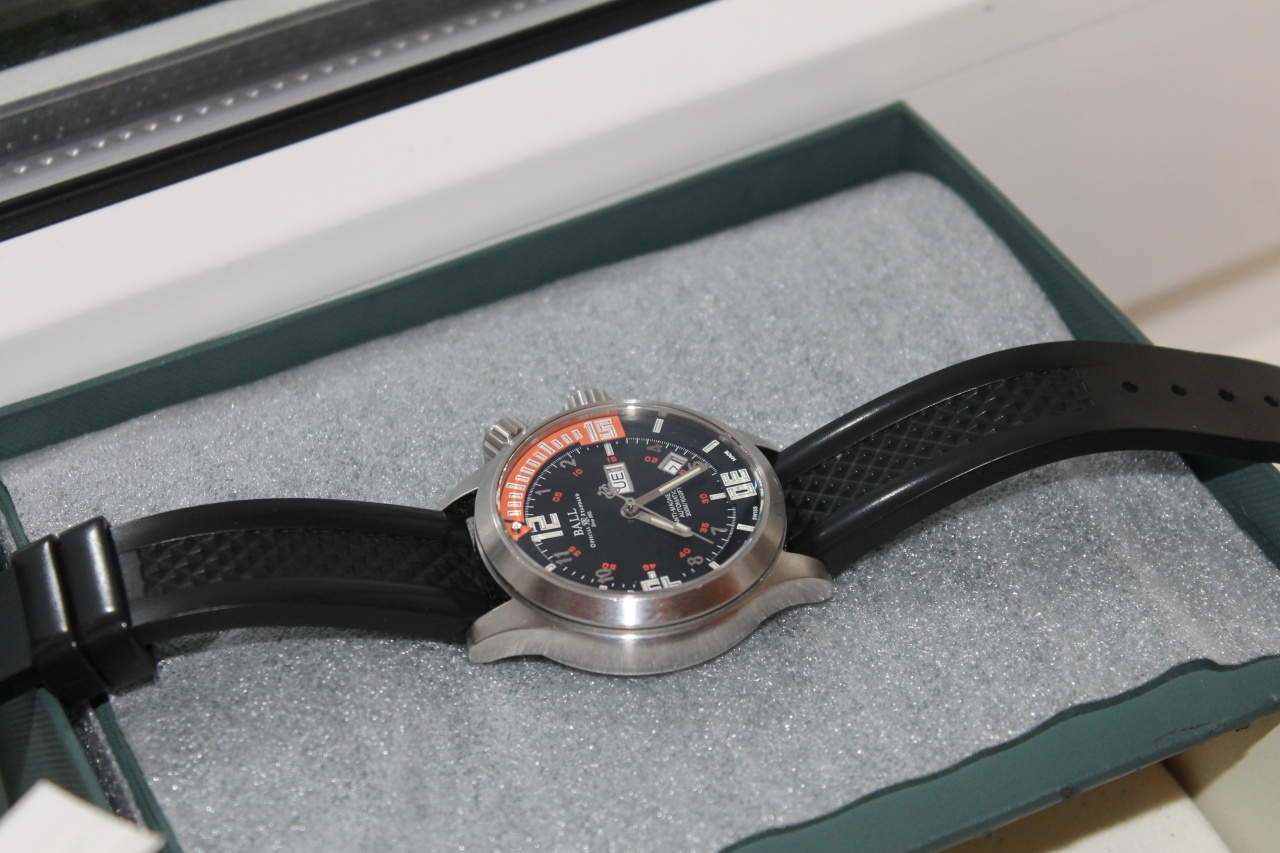 Крупный, красивый дайвер от Ball с вращающейся внутри циферблата 60 минутной шкалой(вращается при помощи отдельной головки) и указателями даты и дня недели.