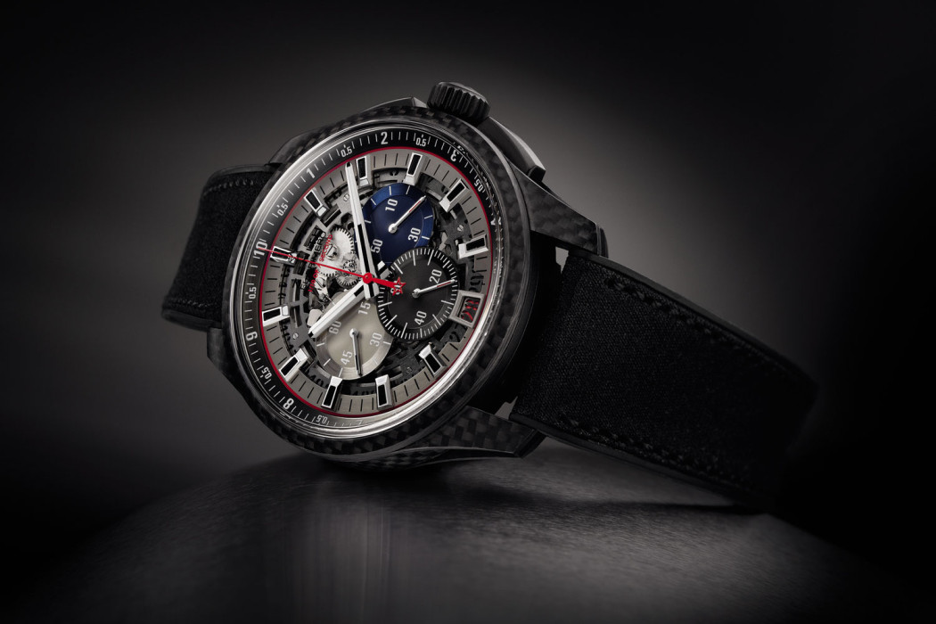 При разработке внешнего оформления нового калибра дизайнеры Zenith взяли за основу корпус часов El Primero Striking 10th диаметром 42 мм, и слегка увеличили его до 45 мм, руководствуясь уже известным принципом: максимально уменьшить вес часов. Для этой цели прекрасно подошел карбон – материал красивого черного цвета с эффектом шашечного узора, который вызывает в памяти ассоциацию с финишным флагом легендарных гоночных соревнований. Кроме того, карбон великолепно отражает спортивный характер этого высокотехнологичного хронографа. Внутренняя часть корпуса выполнена из керамизированного алюминия — сверхсовременного материала, отличающегося легкостью, прочностью и твердостью: 1800 HV по Виккерсу (твердость стали 316L — 160-200 HV). Для изготовления кнопок хронографа и заводной головки мастера Мануфактуры выбрали титан. Ушки с ажурной отделкой, подчеркивающие аэродинамическую форму изделия, плавно переходят в интегрированный ремешок из черного каучука и синтетического волокна номекса с высокими эксплуатационными характеристиками. Ремешок дополнен тройной раскладывающейся застежкой, гарантирующей комфорт при ношении и надежность в эксплуатации.